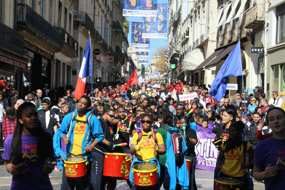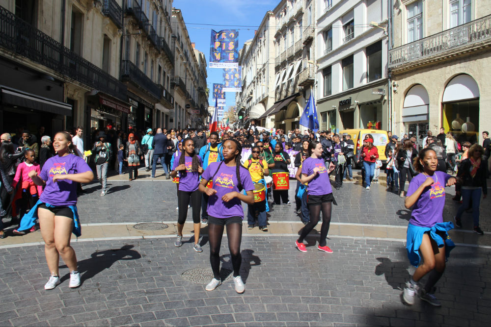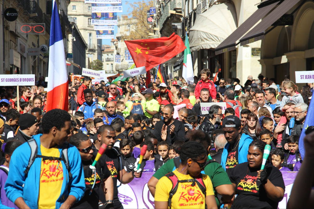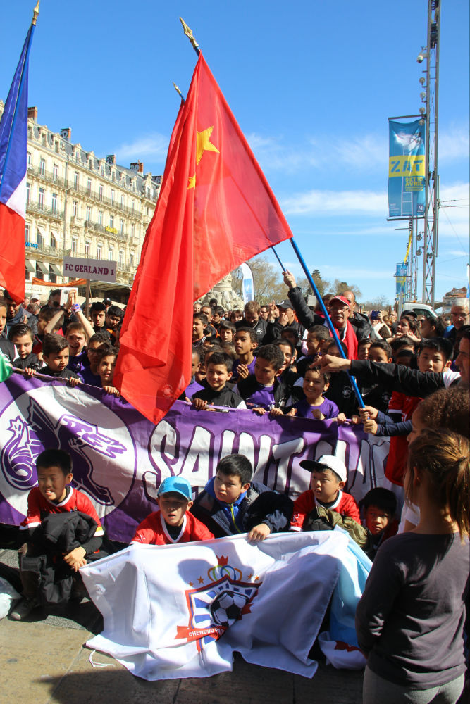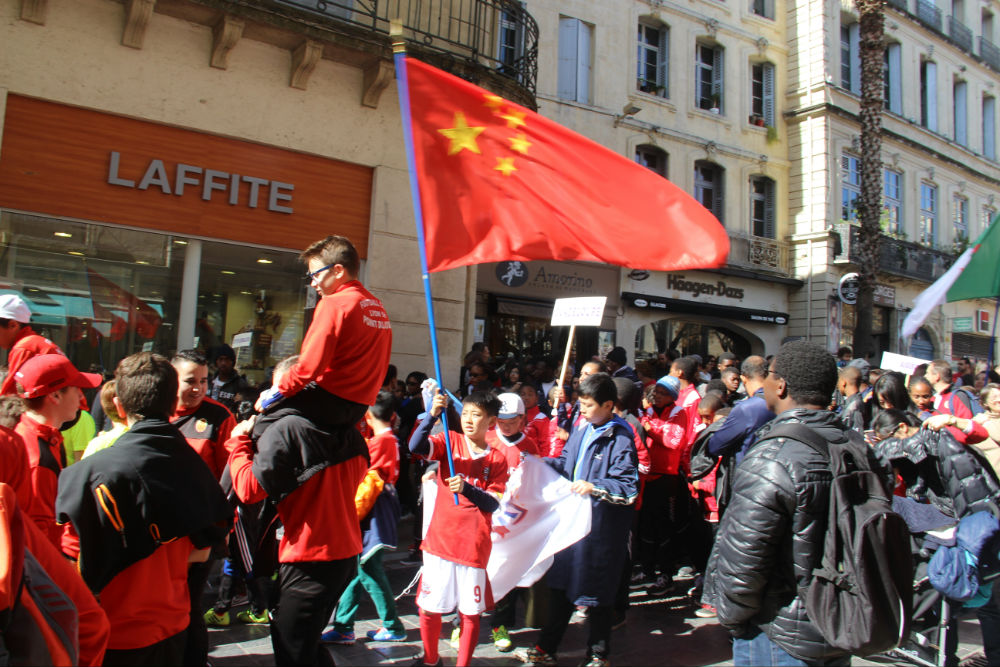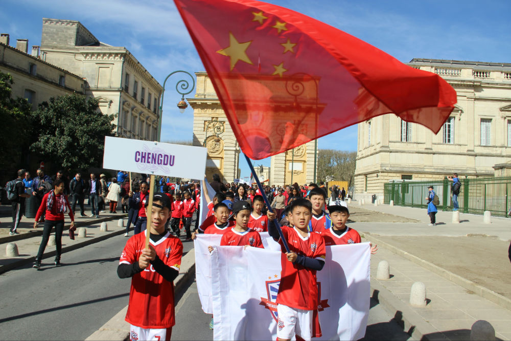 本次开幕式游行活动,起点自蒙彼利埃市凯旋门广场,途经市区街道,最后在市中心广场集合,泡小天府校区代表队走在队伍前列,鲜艳的五星红旗和泡小的旗帜、足球队的队徽一并飘扬在显眼的位置,泡小天府校区泡泡娃们自信的笑容,也让游行的队伍中多了一份惊艳。