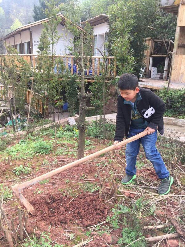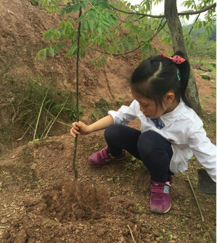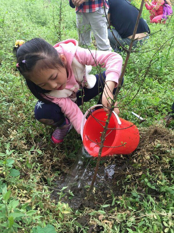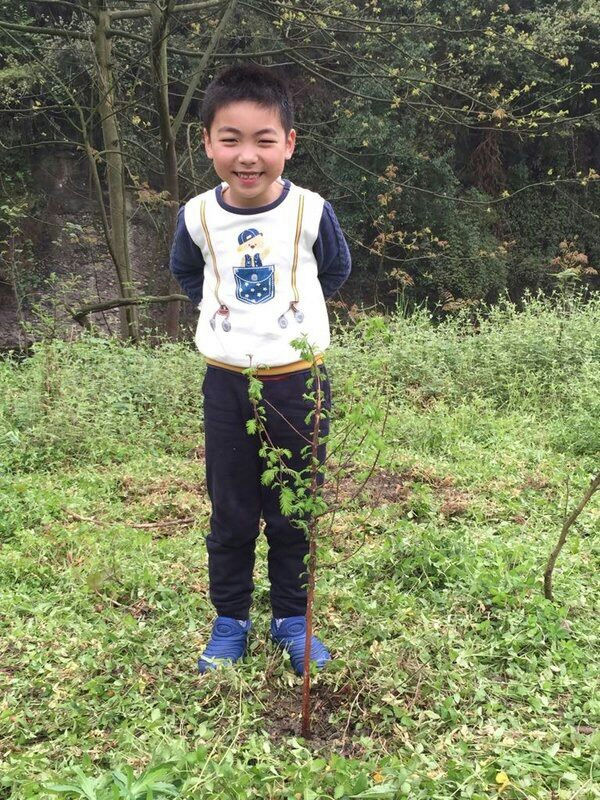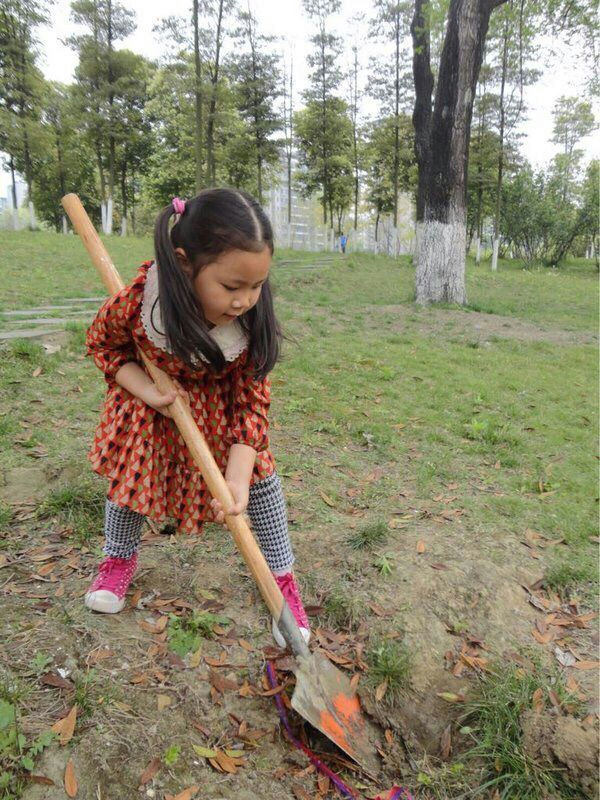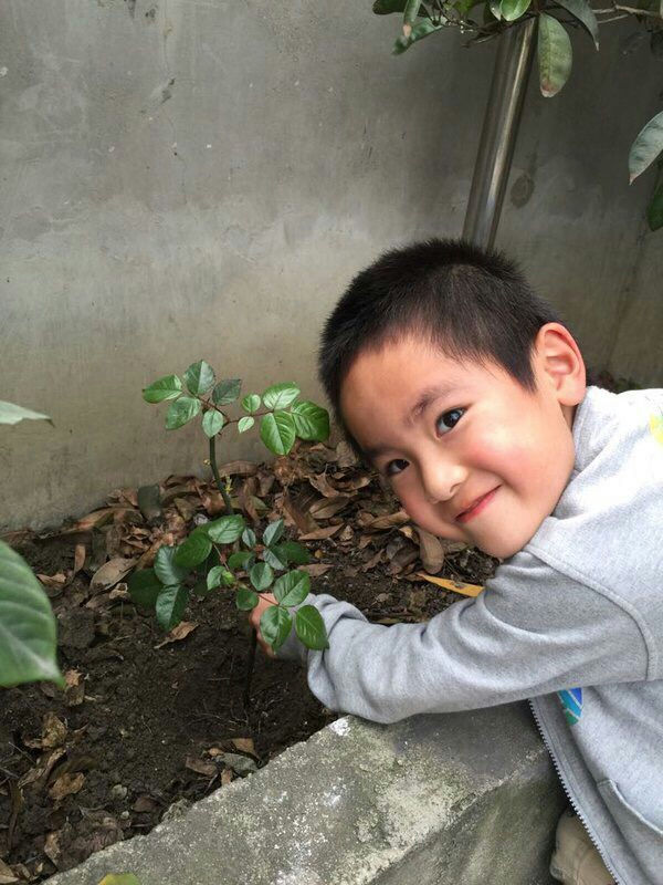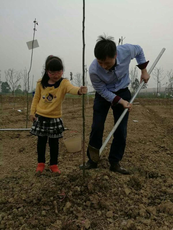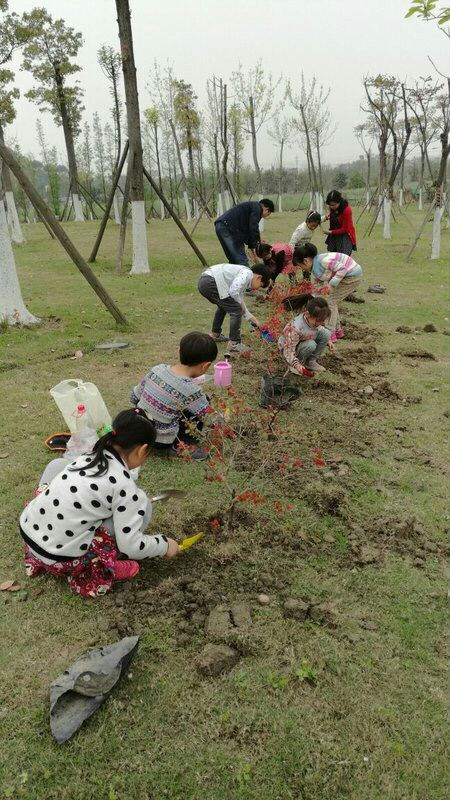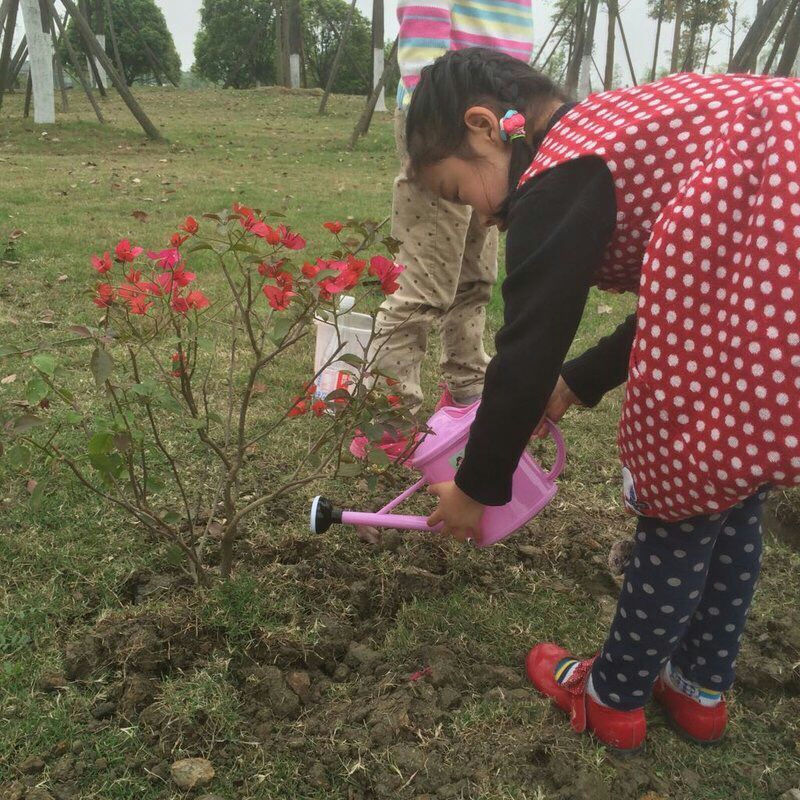 沐浴着拂面而来的春风,呼吸着青青小草和新鲜泥土的气息,小泡泡们精神饱满地投入到植树的实践活动中。在泡爸泡妈的协作配合下,孩子们一会儿用稚嫩的小手握住铁铲挖坑松土,一会儿用轻快的小腿跑前跑后运苗提水,忙得不亦乐乎。当把小树苗放进坑里的时候,他们总是小心翼翼的,一边仔细填土、浇水,一边口中念念有词:“小树,小树,快快长大,明年春天我还会来看你!”在他们的辛勤劳作下,一株株红豆杉、黄角兰、栀子花、三角梅等品种各异的小苗便盎然挺立在春泥中,迎风摆动!