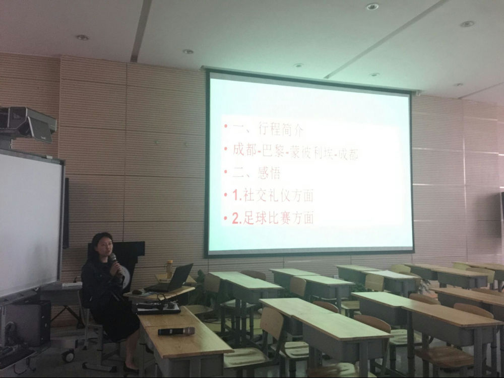 2016年4月5日下午,全体老师齐聚学校多功能厅。巴黎、蒙彼利埃、足球、游行、联欢……原来是赵茜琳老师代表赴法国蒙彼利埃城市参加青少年欧洲足球联赛的师生团队,与全体老师分享在法国的见闻与感想。