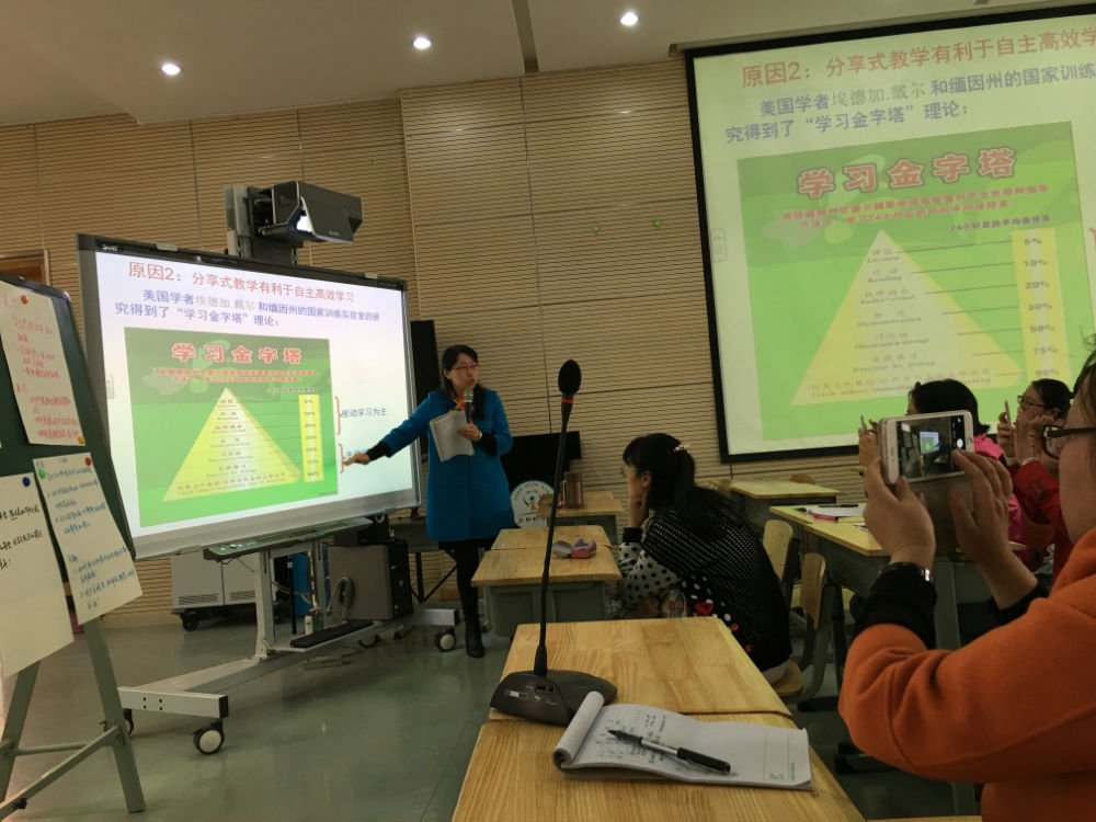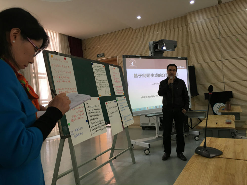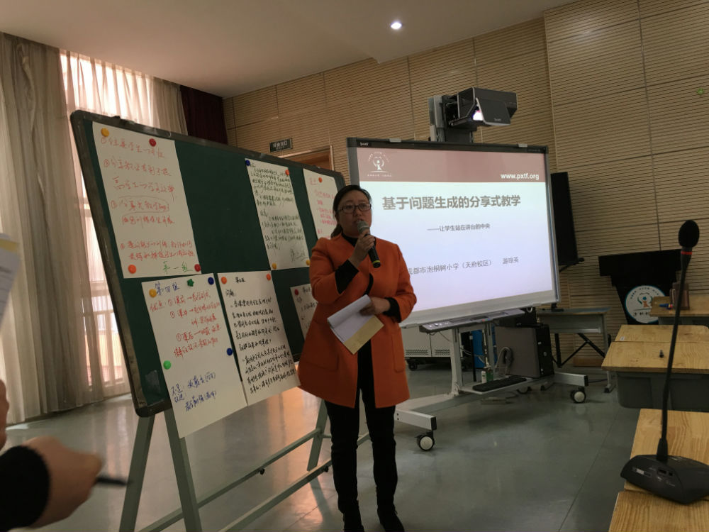 最后,根据骨干班老师们的困惑与需要,全国高研班首期学员、成都市学科带头人游琼英主任做了“基于问题生成的分享式教学——让学生站在讲台的中央”的专题讲座,游主任的讲座摒弃了传统的“讲授式”,而采用互动性更强的“分享式”,基于参会老师的真问题进行解惑,老师们的问题有:怎样关注学困生的学习表现?怎样建立分享的规则?一堂课的容量看起来不大,怎样高效完成教学内容?不同课堂,分享式教学有什么差异?游主任梳理老师们提出的问题后,从“为什么实施分享式教学、怎样实施分享式教学、实施分享式教学的效果”三个方面与老师分享交流,在讲解的过程中,游主任与参会老师不断互动,让与会老师受益匪浅。游主任最后表示,基于问题生成的分享式教学,虽然我校已经取得了一些成果,但我们仍然在路上,欢迎各位同行和我们学校一起进行研究。