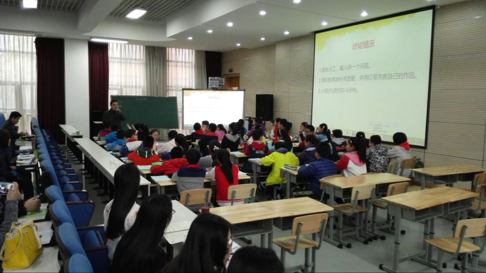 活动首先由付亮和李颖文老师展示两堂分享理念下的数学课,两堂课有许多共同的地方:首先由孩子提出想研究的问题,老师与孩子们一起梳理出本节课的核心问题,接下来由孩子们探究核心问题,最后在互动交流中解决核心问题。两堂课中,老师充分退让,让学生站在讲台的中央,学生的表现非常精彩。当然,两堂课也各有特色,付老师的课堂幽默大气,李老师的课堂细腻理性,给人不一样的感受。