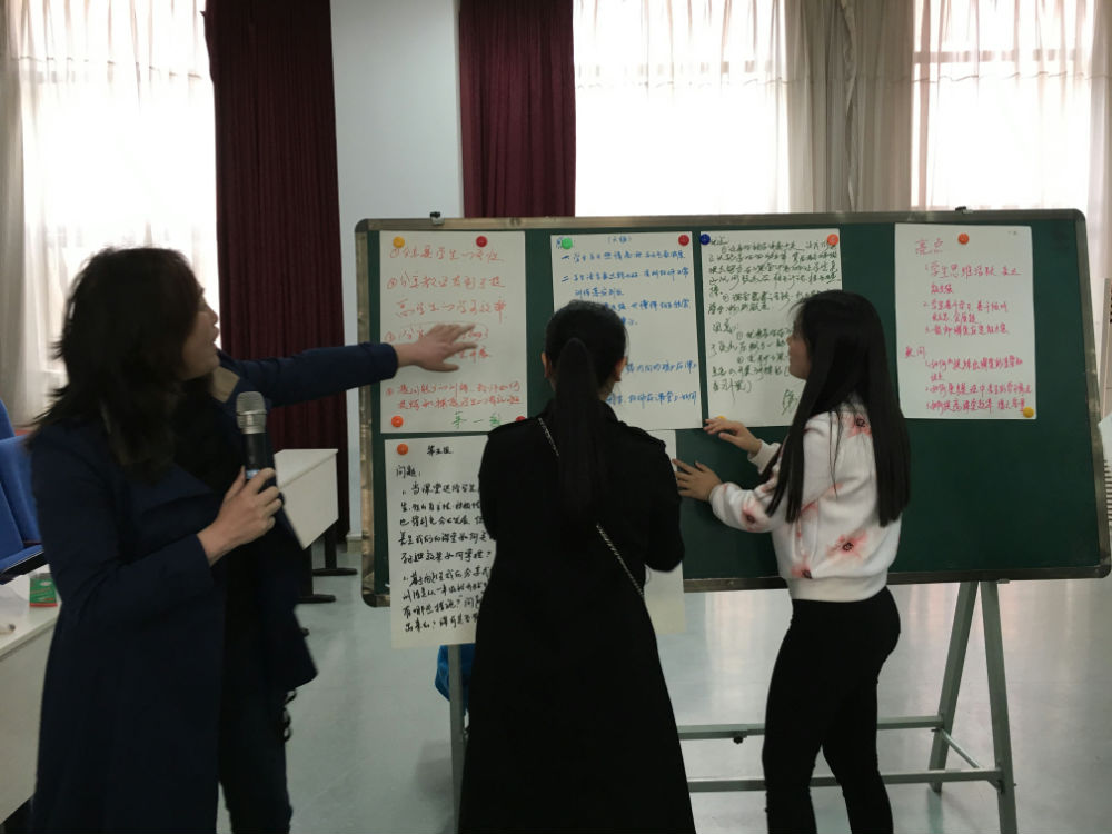 接下来陈莉主任带领区骨干班的老师对这两堂课进行评课议课,老师们对这两堂课进行了充分的肯定,夸赞两堂课上孩子们的学习能力很强,学生的表现非常精彩。骨干班的老师也提出了他们的困惑,游琼英主任边听边记录下老师们的困惑。