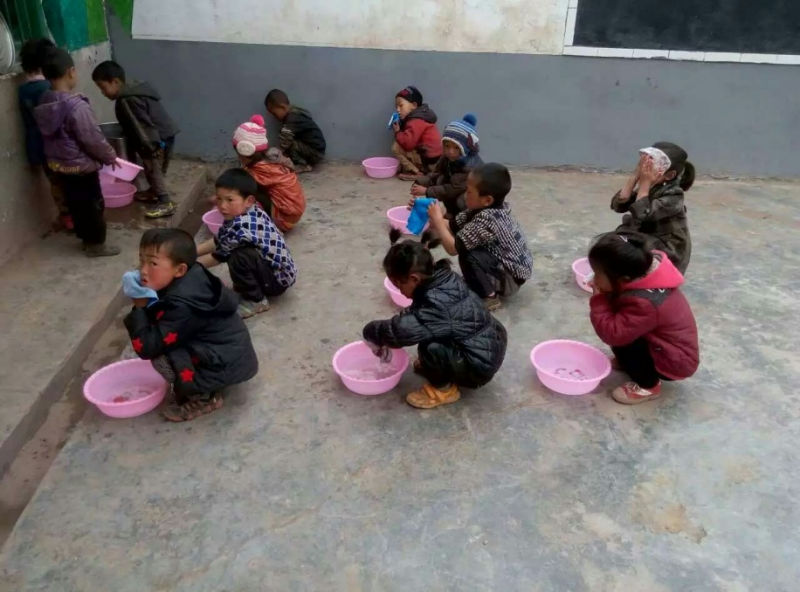 虽然条件艰苦,但是孩子们洗手都洗得无比认真