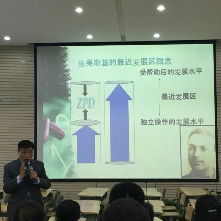 讲座伊始,蔡教授让大家写出想培养什么人,准备怎样培养,让老师们反思:目标与方法是否一致,引出讲座主题:我们应该怎样培养学生?然后,蔡教授用生动形象的图片来告诉大家合作的重要性,教育是尊重每个学生的个性特长,扬长补短,以合作之力达到目标。蔡教授谈到,中国教育的现状是把孩子的天性抹杀,把非天性的东西强加给孩子,导致一个个充满个性的孩子在通过学校教育后,变得失去本心、个性,变得一模一样。随即,蔡教授指出,教育工作者要肯定孩子的个性,用激发孩子学习的潜能,让他们活出自信。接着,蔡教授带领大家探讨:教师在课堂上应该怎样指导学生,让他的潜力得到最大发挥。蔡教授这这样操作的:课前让学生写下自己特别想知道的问题;课中,采用对比、排除、联想等方法多给学生一些关于知识的连接;课后,让学生写下自己的困惑。这样的课堂才能高效。最后,任景业老师和蔡教授就“脚手架”问题展开了讨论,并一致认为:课堂上应该少给学生搭架子,让他们通过主动探究合作学习解决重点问题。