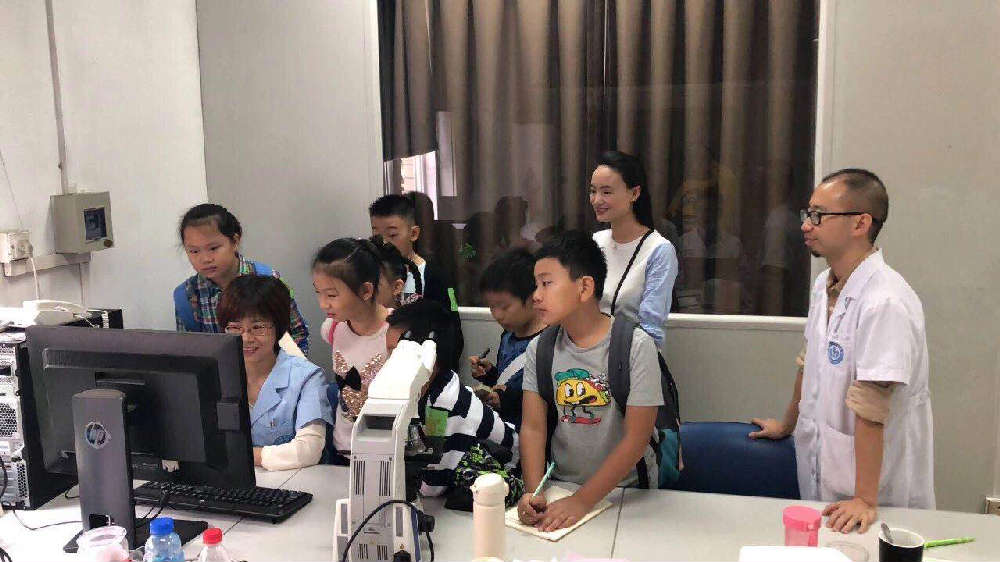 华西医院第一科研楼,科学家体验小组在国家青年千人科学家的带领下,体验了显微镜下观察人体皮肤,了解汗腺出汗的生理现象,通过观察科学实验,看到了激光共聚下观察内脏器官功能和形态,亲眼目睹了小白鼠麻醉实验。