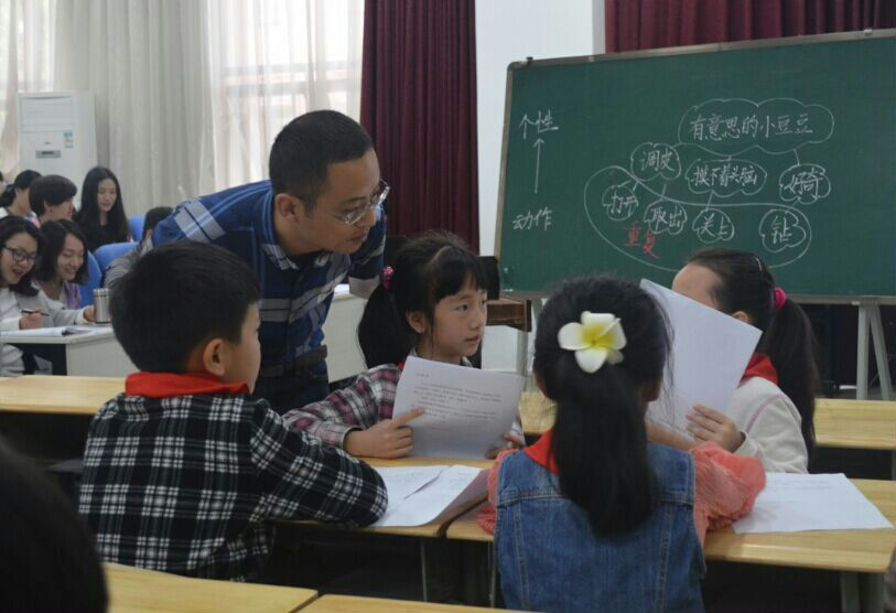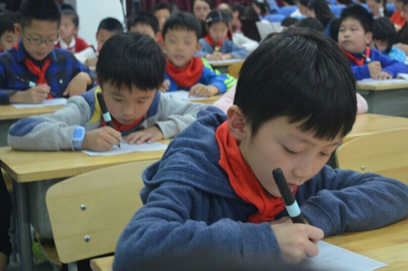 上午第一节由成都市泡桐树小学(天府校区)的黄玉军老师执教三年级《读写结合之动作描写》。未成曲调先有情,活动伊始,黄老师便以本册五单元“读书”单元引入,孩子们齐声诵读读书名言,做了简单的读书分享,在孩子们意犹未尽之时,黄老师便巧妙地以《窗边的小豆豆》中一段关于“小豆豆”的描写引发孩子们的学习兴趣,让孩子们畅谈对小豆豆的印象,营造了浓浓的分享式学习氛围。而后,黄老师不断引导孩子们层层深入阅读学习材料,让“小豆豆”的形象更加立体地呈现出来。在带领孩子们走进文本的同时,黄老师还不忘引导孩子们“跳出”文本掌握方法,明白“小豆豆”的形象如此丰满立体,是源于作者抓住了小豆豆的一系列动作的描写。纸上谈来终觉浅,之后孩子们又结合自己身边的人和事,自由选材,进行片断写作练习,一段段充满童真童趣的文字让现场不时回荡着欢笑声。另外,值得一提的是,孩子们在片段练习的时候巧妙地运用了“智能笔”这一信息媒介,它能将所有孩子的写作过程及时地展现在大屏幕上,目前蒙彼利埃小学和泡桐树小学(天府校区)都已“握”上了“智能笔”。