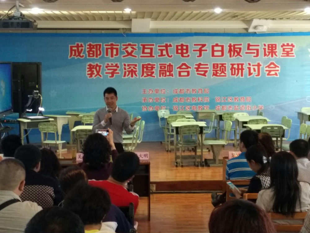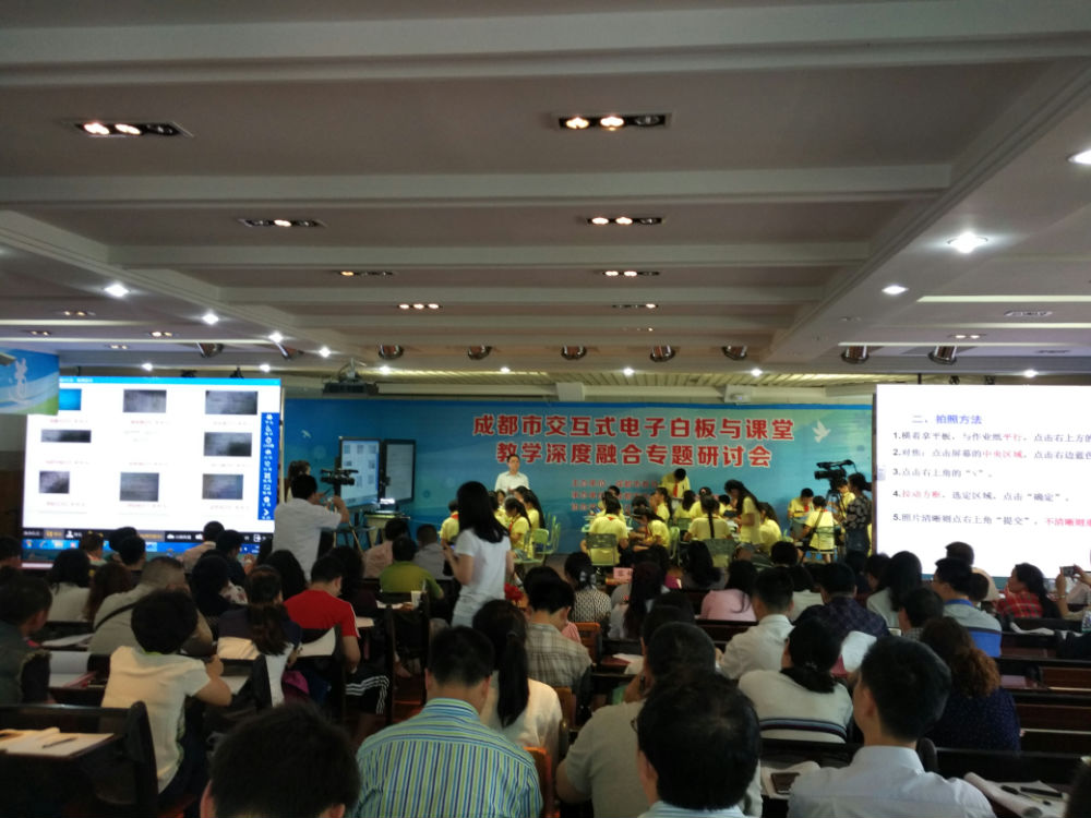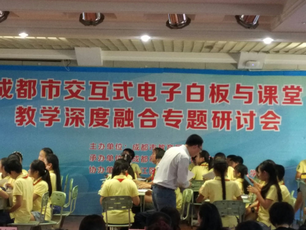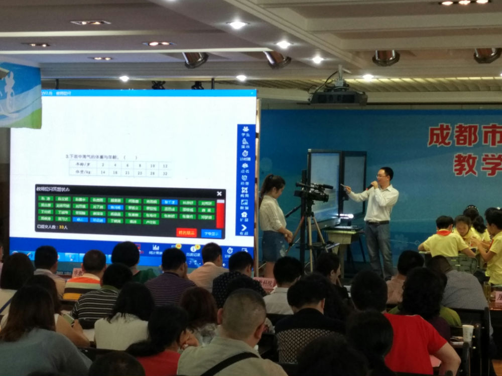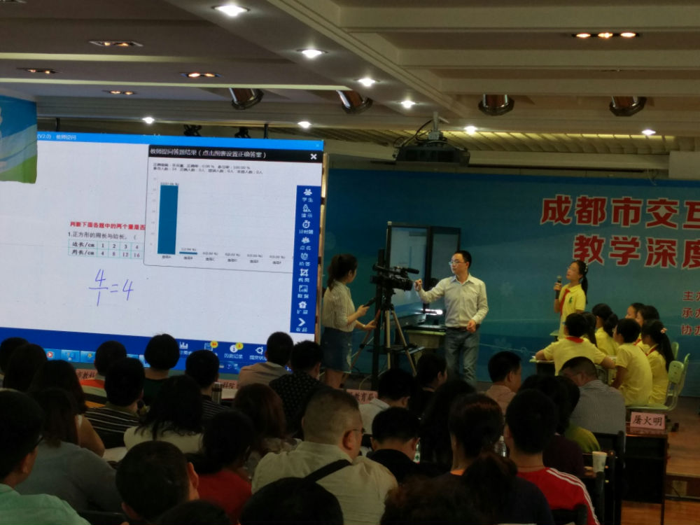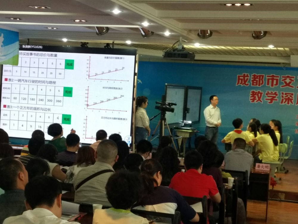 5月10日,成都市交互式电子白板与课堂教学深度融合专题研讨会在盐道街小学召开。会上,我校付亮老师献上了观摩课六年级数学《正比例》。付老师执教的《正比例》,采用了一对一数字化环境下的分享式教学方式。独立思考时,学生借助平板上的数学App探究数学知识;全班分享时,学生利用平板的拍照功能上传典型代表作,通过与电子白板的交互展示思考过程;练习环节,借助云平台的及时反馈功能,直观地呈现了学生对本节课的掌握情况。付老师的课以学生的生成为教育资源,运用一对一数字化技术和白板的交互功能有效地调动了学生的学习积极性,受到了参会专家与一线教师的好评。