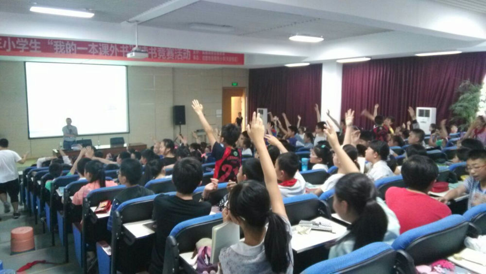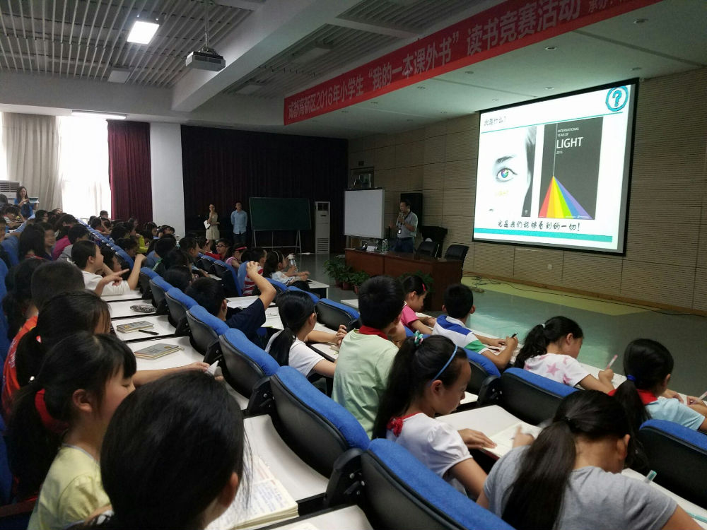 接着范斌博士为五六年级孩子们带来了一堂精彩的科普讲座《光的故事》。 首先从生活中的光学现象入手,通过讲解光的反射、折射、衍射、色散等让同学们了解光的一些基本特性。紧接着,范博士用生动的解说让同学们知道了近视,远视、散光的产生原理以及如何正确用眼。最后引入“黑洞”、望远镜、外星人等同学们感兴趣的话题,现场气氛达到高潮,同学们惊叹于宇宙的美丽及天文望远镜的精密,同时对于光的本领更加好奇,纷纷向范博士提出疑问,范博士也为孩子们一一解答。