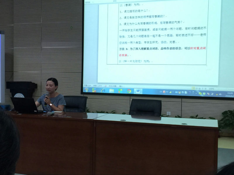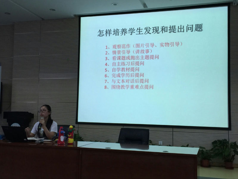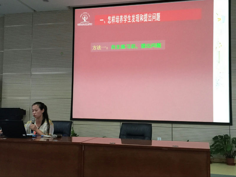 第一位发言的是王瑛老师。王老师从语文教学的特点出发,提出根据不同的文章题材可以从质疑人物、标题、重点语句、核心观点提出问题;聚焦问题方面采取将问题分层法、主线法;在真问题展开教学方面采取分享式教学。第二位发言的是美术组黄茜老师,结合美术学科特点,她总结出在培养学生提出和发现问题方面可以从:观察范作,情景引导,看课题或抛出主题提问,自主练习候提问,自学教材提问,完成学力单后提问,与文本对话后提问,围绕教学重点提问。接下来发言的是英语组赵茜林老师,她提出要打造“发现式”英语课堂探究;品综组毛眀玥老师,她结合具体例子《花格子大象艾玛》向我们展示在品综课堂上学生可以根据课题,情景,图片等提问。体育组牟英老师,她从自主练习后,提出问题;模仿练习,教师引导学生自己发现问题、比较法、分组练习发现问题这四个方面培养学生发现和提出问题。最后出场的是数学组付亮老师,付亮老师幽默又具有感染力的语言一下子吸引了全场老师的注意。不同于其他学科在提出和发现问题方面,他采用的方法是:独思生疑,载体:学力单;在聚焦问题方面他采用了排序法和大问题法;教学展开方面,他采用了在小组讨论“1.让思路更清晰; 2.获得不同方法;3.解决简单问题;4.培养表达能力。”的基础上全班分享。