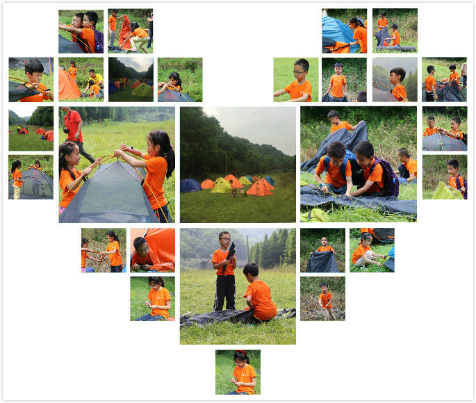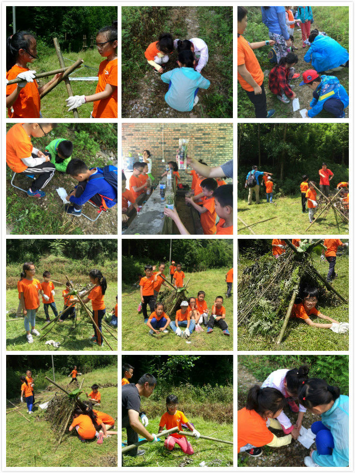 周日上午阳光灿烂,一早就开展“野外生火”:通过摩擦镁棒引燃纸或干草获得火种。在经过教官示范演示后,三人一组申领镁棒,扎堆实践。有的组很快打出了火,有的组小手都磨出了泡,也未能成功。孩子们互相寻找、传授经验,经过反复试验,最终各组都成功了。对新事物的好奇,加上努力后获得成功的满足着实让同学们兴奋不已。接着“水源过滤”:通过制作五层滤水层,让混浊的水变成清澈的水,满足烧开后即可饮用,在野外或地质灾害(地震)后缺乏饮用水的情况下,能做到自我求生。最后“搭设临时庇护所”:用大自然中资源搭设一个临时遮阳挡雨的场所。孩子们顶着烈日,在教官们的指导下,陆续完成了上述任务。看着一个个淌满汗水的小脸,红红的小手,我们每个人都由衷地感到欣慰和骄傲。