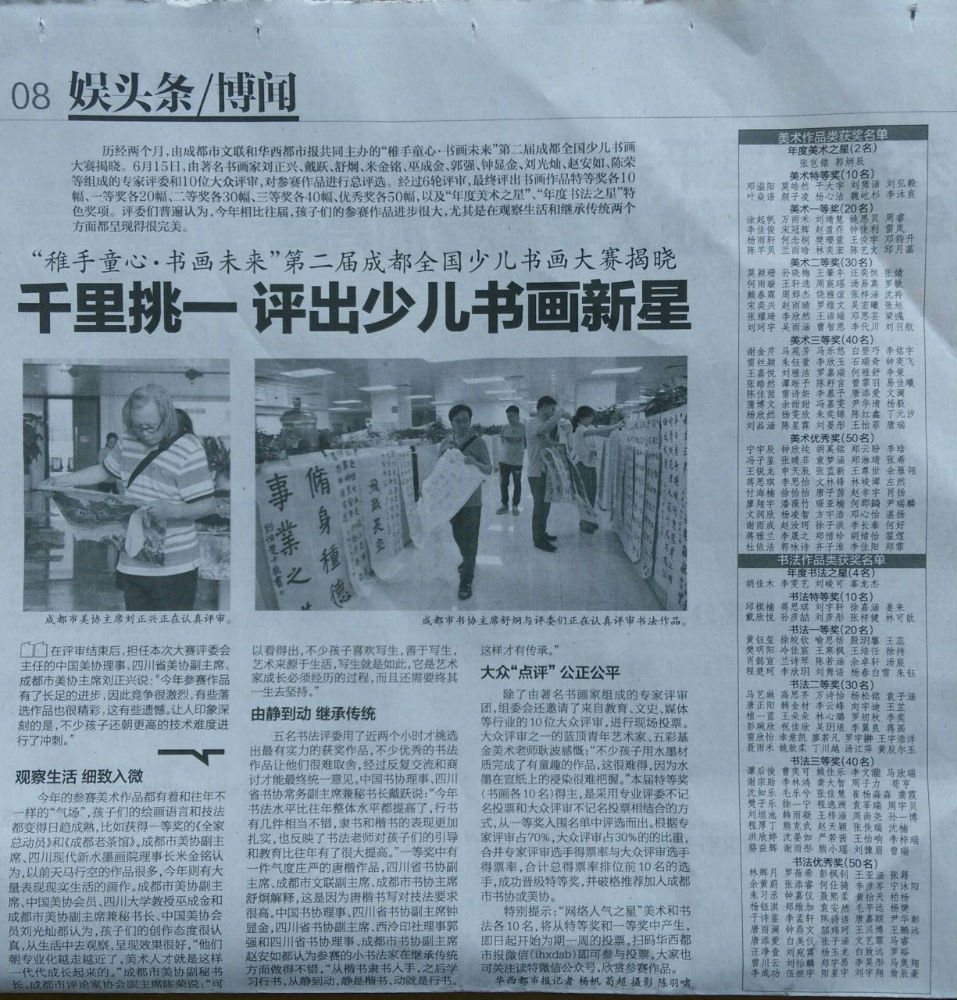 听闻“稚手童心·书画未来”全国少儿书画大赛举办的消息,我校几名喜欢书法的小泡泡便一腔热情的用自己平时社团课的书法作业投了稿。该比赛汇集了全国爱好书法的小朋友,参赛选手上万人,且大多是精心准备的高难度作品。在这场千里挑一的赛事中,我校同学分获二三等奖,并被刊登在2016年6月20日的华西都市报文娱头条。特此祝贺,望再接再厉!