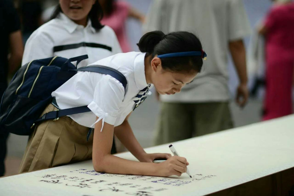 “我相信有一双手,把我轻轻牵到你跟前……”下午6:30,伴随着轻缓舒适的歌声,身着漂亮服装的小泡泡们,在爸爸妈妈的陪同下,兴高采烈地走进校园。绿荫掩护下的“天府梦工厂”处,孩子们一一庄严地接过泡小天府芶校手中的的小学毕业证书,芶校深情地一一给予孩子们祝福,并留影纪念。几米长的白色卷轴一字排开,上面工工整整地排列着孩子们的签名。梦工厂的右侧,签名墙上硕大的“时光珍重”几个字特别醒目,上面挨挨挤挤地布满了孩子们的个性化签名。签名墙下,大泡泡、小泡泡簇拥一起,满面春风,与老师合影,与同学合影,家庭合影,同班泡妈、泡爸合影。大家喜笑颜开,兴奋激动的交流声此起彼伏。珍惜这美好难忘的时光,都想把这一刻固定在这里。