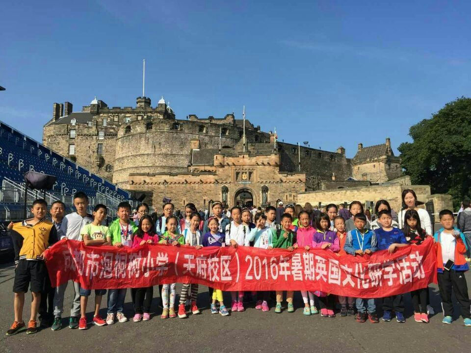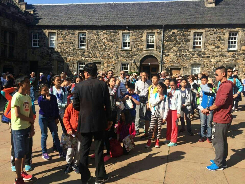 爱丁堡是以城堡为中心发展成的城市,人约50万,城名"Edinburgh",意指在斜坡上的城塞;苏格兰市区大致分成两部分,以王子街公园为界,往南是建于16世纪的旧城区old town,往北则是经过都市计划于18世纪改建的新城区new town;以城堡为首的许多观光点,都是苏格兰独立王国时期的历史古迹。在随行老师的介绍中,师生很快到达了今天第一个目的地——爱丁堡城堡。古老的爱丁堡城堡在6世纪成为苏格兰皇室堡垒,至此它成为重要皇家住所和国家行政中心。它筑于海拔136米高的死火山岩顶上,一面斜坡,三面悬崖。同学们排成两列随着众多游客往古堡上走,在城墙上同学们看到整整齐齐地安放着乌黑的古炮,炮口一致面对对岸福斯湾河,演绎着古时防御森严的紧张气氛。紧接着同学们进入了古堡内,参观了历代苏格兰皇室的皇冠、权杖、宝剑、首饰和肖像,以及中世纪以来的兵器与军装;在参观的过程中,孩子们看到了古时英格兰与苏格兰长期战争的历史遗留,从这些文物中,孩子们体会到了爱丁堡人强悍与不屈的精神,这种精神也造就了整个苏格兰人民的精神风格。