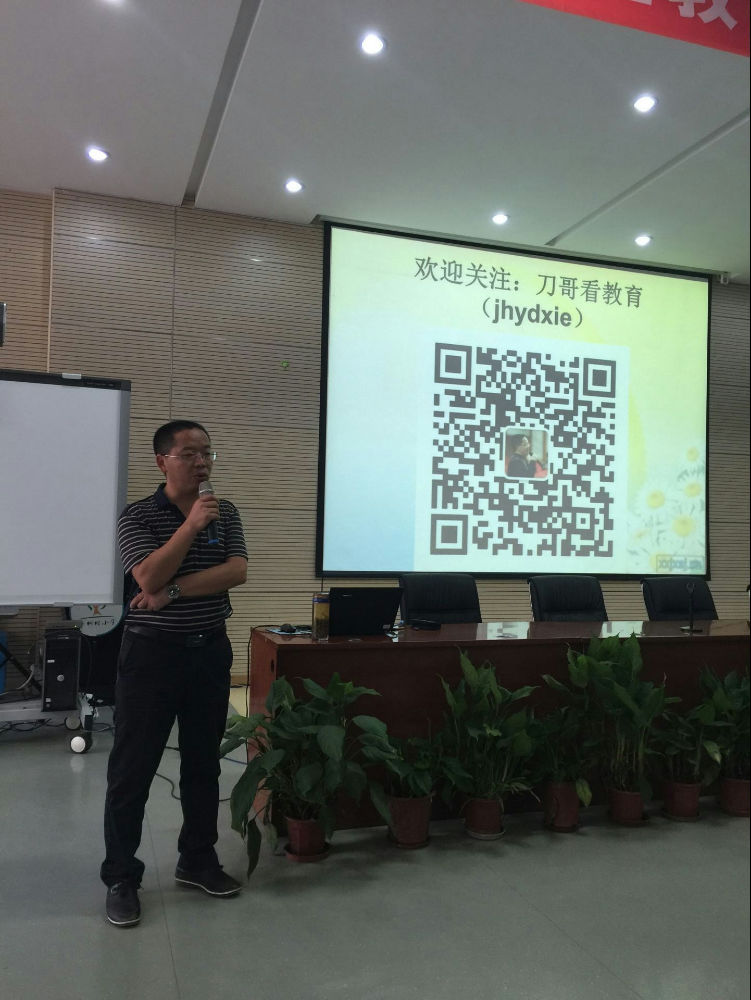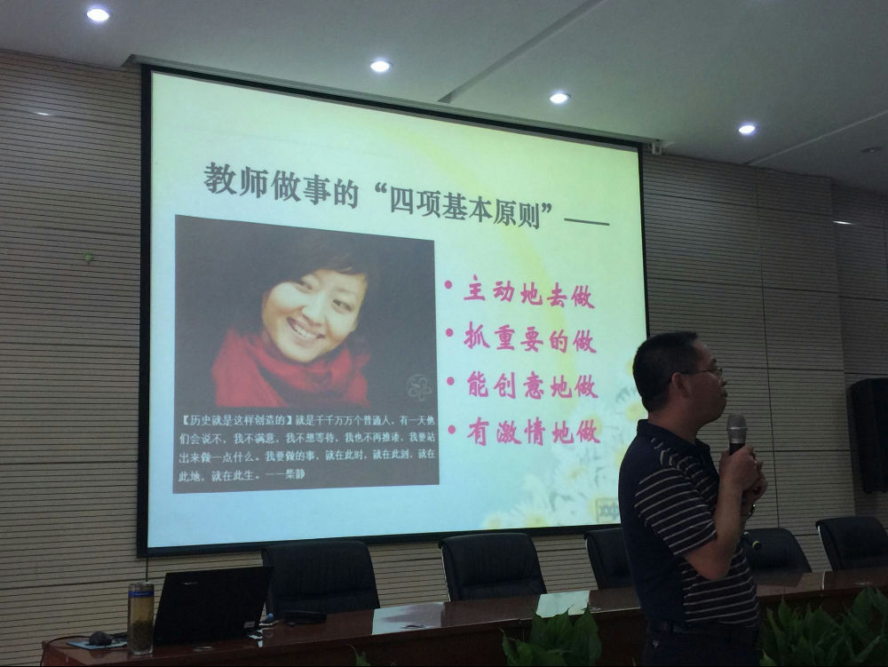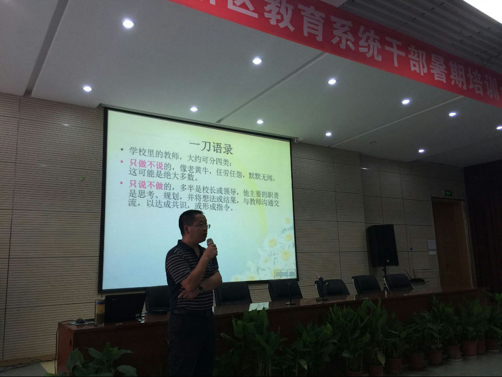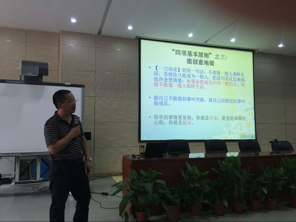谢云老师从“一个中心”、“两个基本点”、“三个代表”、“四项基本原则”四个方面深入细致地阐述了教师如何做事这一主题。他风趣幽默的开场,铿锵有力的话语不仅给学员老师们留下了深刻的印象,同时让即将进入工作岗位的老师们对教师这一职业有了更清晰的认识,对教育事业有了更深入的理解,对肩上所担负着的责任有了更准确的定位。无论是当谢云老师一字一字地说出“教育是良心的事业”时的坦然,还是当他把教师与教育之间的关系定义为“婚姻”时的风趣,抑或是当他谈到一刀语录时的昂扬激情,此间种种仿佛都是智慧思想的无数次碰撞所成就的一篇篇慷慨激昂的诗。每到精彩处便有人忍不住为之鼓掌,为之动容。