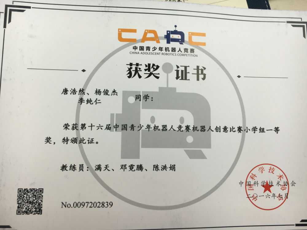十六届中国青少年机器人竞赛 | 杨俊杰、唐浩然、李纯仁 | 机器人创 意比赛 小学组 一等奖 | 满天、邓霓腾、陈洪娟 |