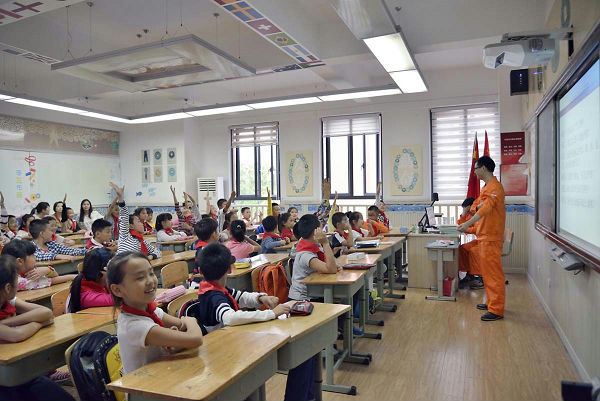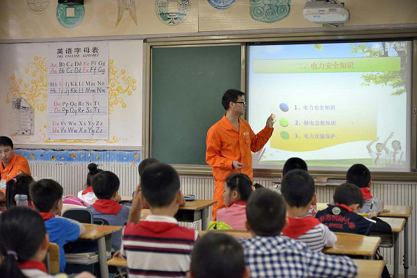 主讲的嘉宾是国家电网的刘先生,黑框眼镜配橙色工作服的帅哥一枚,这颜色就已经表达了足够的稳重和安全意识。如果当年风靡一时的台湾偶像剧《流星花园》是在大陆选演员,刘先生,我们所有大泡泡小泡泡都给你拉票点赞哈。看看,同框的还有我们靓丽的班主任刘老师,那就这样定了,再整一出电视剧《一起还看流星雨》,除了实力之外,还有颜值加分。