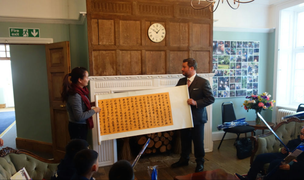 第二天早上,20名二、三年级的学生正式入学,边境橡树学校的校长热情地接待了小朋友们,并赠送了每位同学一个风筝,祝愿他们有所收获,越飞越高。领队曾校长也将老师的书法作品《兰亭集序》赠予了对方。