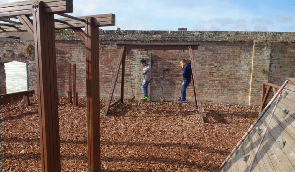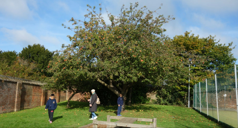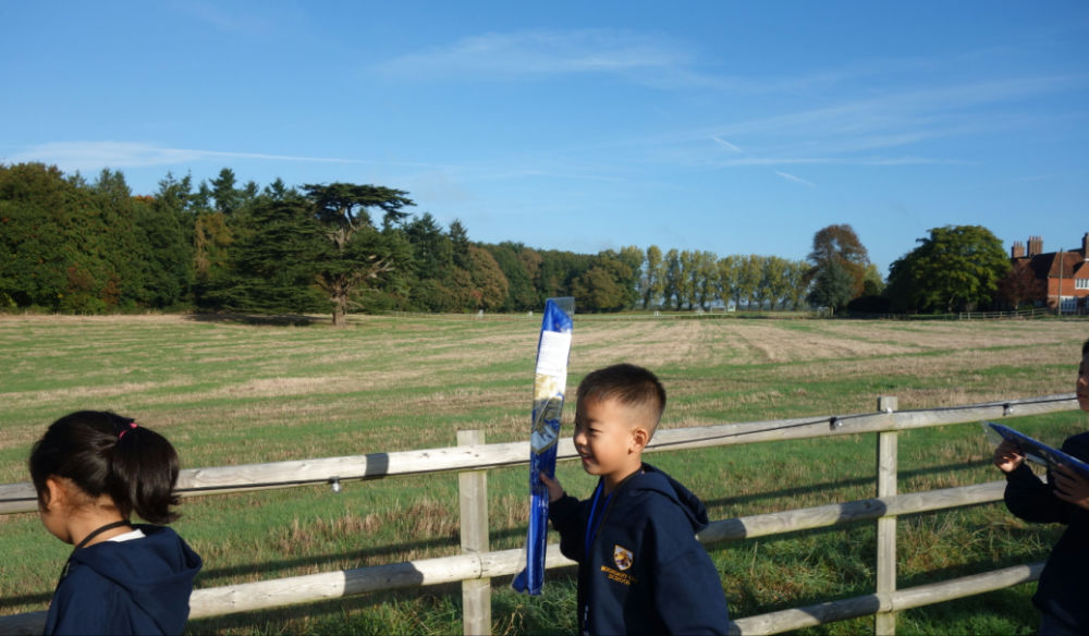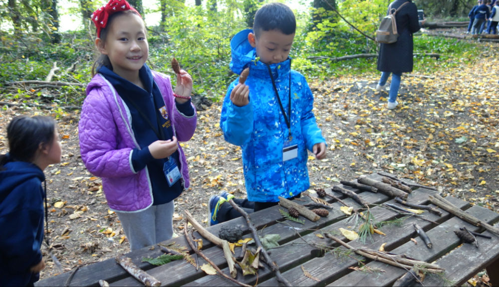 穿上校服、佩戴好边境橡树学校的学生卡后,Ekin老师带领同学们参观了美丽的校园。边境橡树学校历史可追溯至500年前,现在学校的主教学和宿舍综合楼即为500年前的典型英国建筑,学校最年轻的正大门,至今也有150岁的高龄了。学校拥有160亩私有土地,其中,百年参天大树的树林、室外恒温游泳池、马术场、剑术场、板球场、戏剧厅等都是学生们可随时免费享用的。学校里还有一片森林,森林里的石桌上放满了各种树枝,这是英国小朋友想告诉我们,这片森林里有哪些树。在果园里,满地的苹果正重复着牛顿的故事。运动设施下面的棕色的屑,看似碎石块,实际上那是非常安全的缓冲材料。