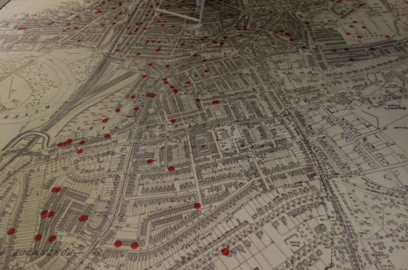 永不沉没的泰坦尼克号沉没了,但是你不得不相信,因为你正踩在一张放大的南安普顿地图上,几乎地图上的每一条街道都被铺天盖地的红点覆盖了。每一个红点都代表着这片区域在船难中失去了它的居民。不祥的红点似乎在解释着这座城市何以念念不忘一场灾难。
