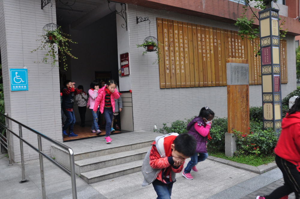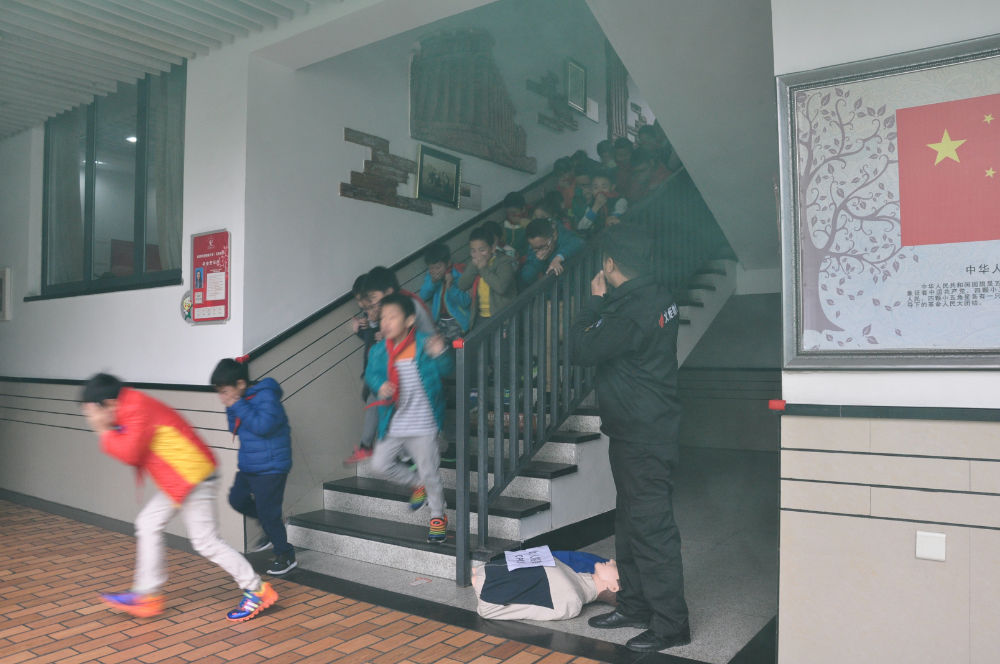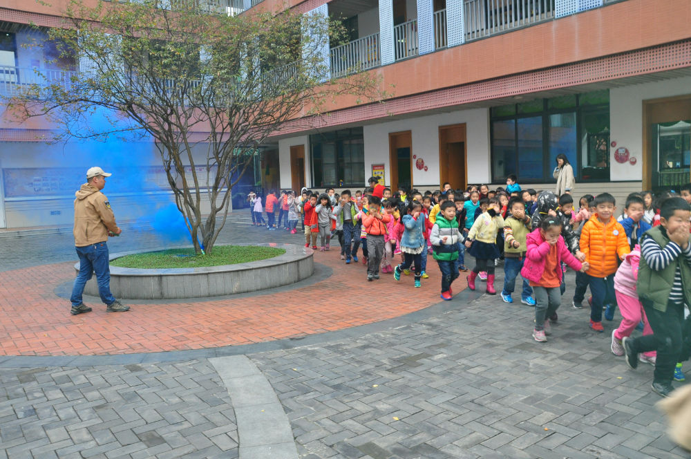 此时,只见教学区的花坛旁、走廊上燃起了一团团烟雾,紧接着,学校广播里播出了急促而紧张的安全警报声。49个班的学生们在班主任老师的指挥下,以最快的速度冲出教室,有秩序地撤离到操场。随后班主任老师迅速清点人数,并报告至大队部。