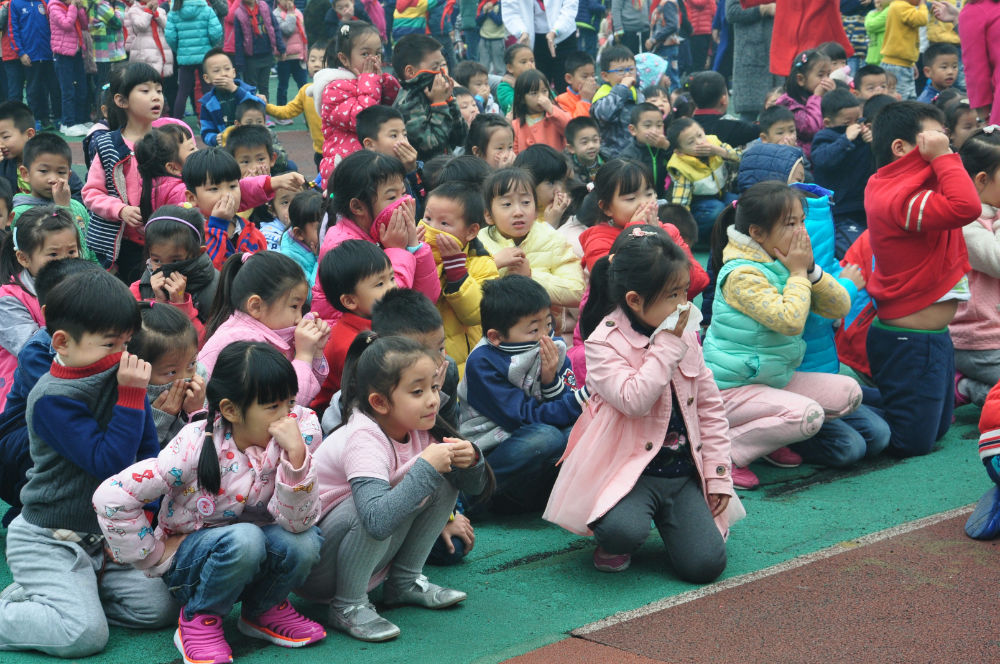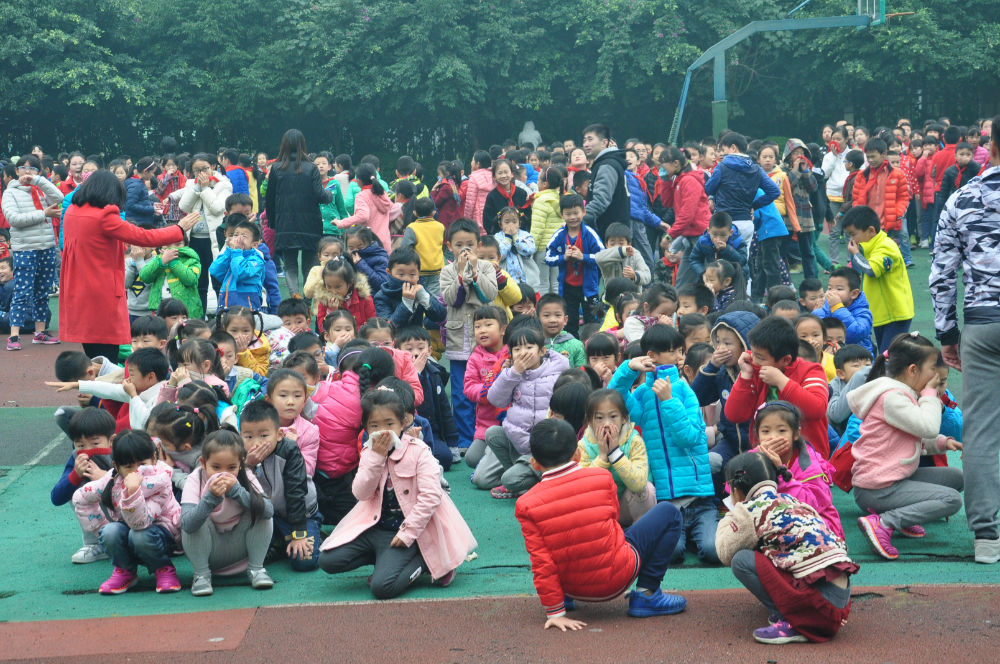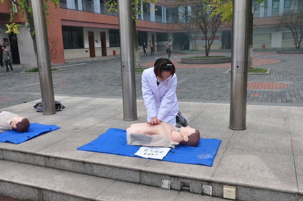 在全校整队完毕后,校医与学校的老师还为孩子们进行了现场的心脏复苏演示。孩子们看得认真、仔细,不时发出感叹。