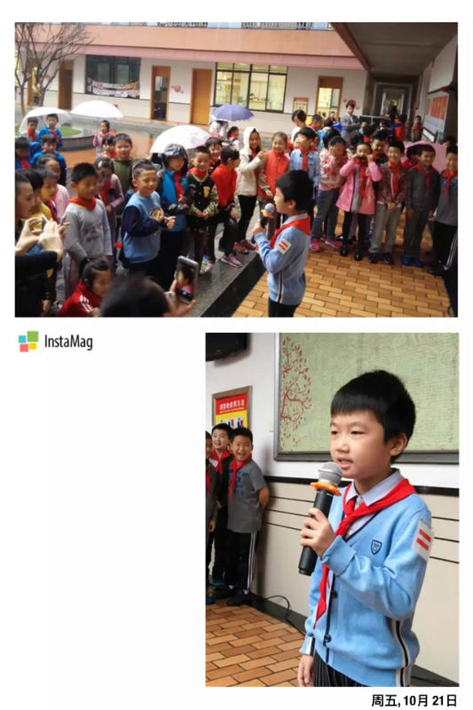 3.5班小主持人李雨梦 拿着话筒为3.7班戈梓淇传递音量,多么温暖的场面。