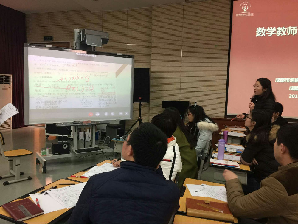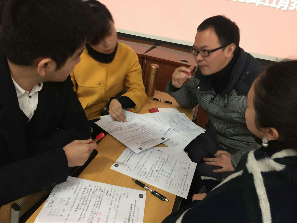 接下来,全班分享开始了,此时,主持人唐治国老师登场了。“谁来分享第一题?”唐老师话音一落,老师们纷纷举手,“机会是自己争取的!”宋敏、李亮、付亮、张利成、彭寿建、徐媛、周晓霞、严敏、陈平、李杰等老师竞相发言,主持人先将发言老师的作品用手机拍照上传到大屏幕,然后请作者来分享,老师分享后,马上跟一句“谁有疑问和补充呢?”大家善意的一笑,仿佛穿越到了自己的数学课堂上。紧接着,其他老师纷纷质疑与补充,唐老师也充分发挥了他的幽默的天性与敏锐的捕捉能力,与发言老师们一起将活动不断推向高潮。在大家的分享与辨析中,学科本质,数学思想,思维方式被层层剥离,一步步呈现到老师们眼中,老师们发出惊叹,原来数学这么简单。是啊,大道至简,在数学课堂中,学生是基础,可老师是高度,我们老师的作用就是要让学生在原有知识与经验的基础上得到提升,或是思想方法的渗透,或是思维方式的习得,或是前后知识联系的建立等等。