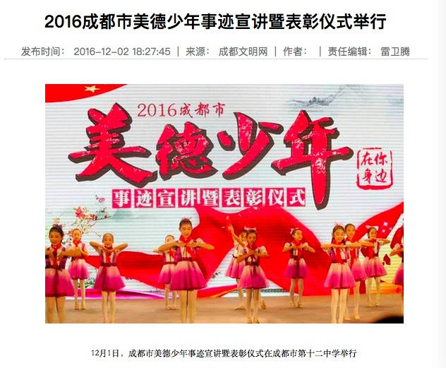 “做一个孝顺父母、富有爱心、诚实守信、勤俭节约、自强不息的好少年”12月1日,“美德少年在你身边”2016成都市美德少年事迹宣讲暨表彰仪式在成都市第十二中学举行。