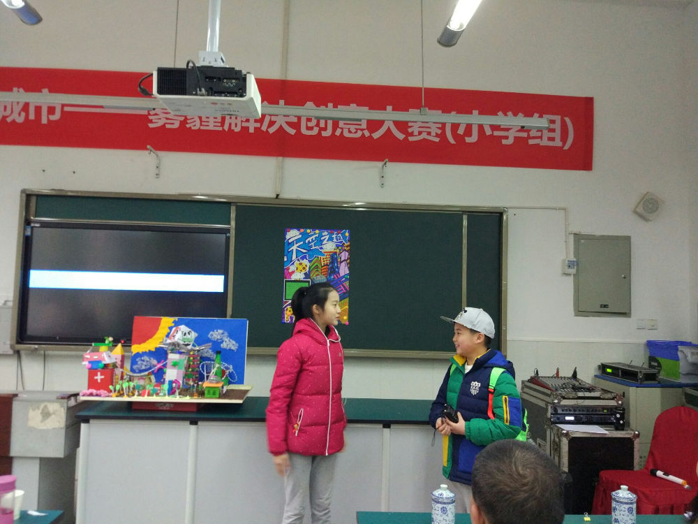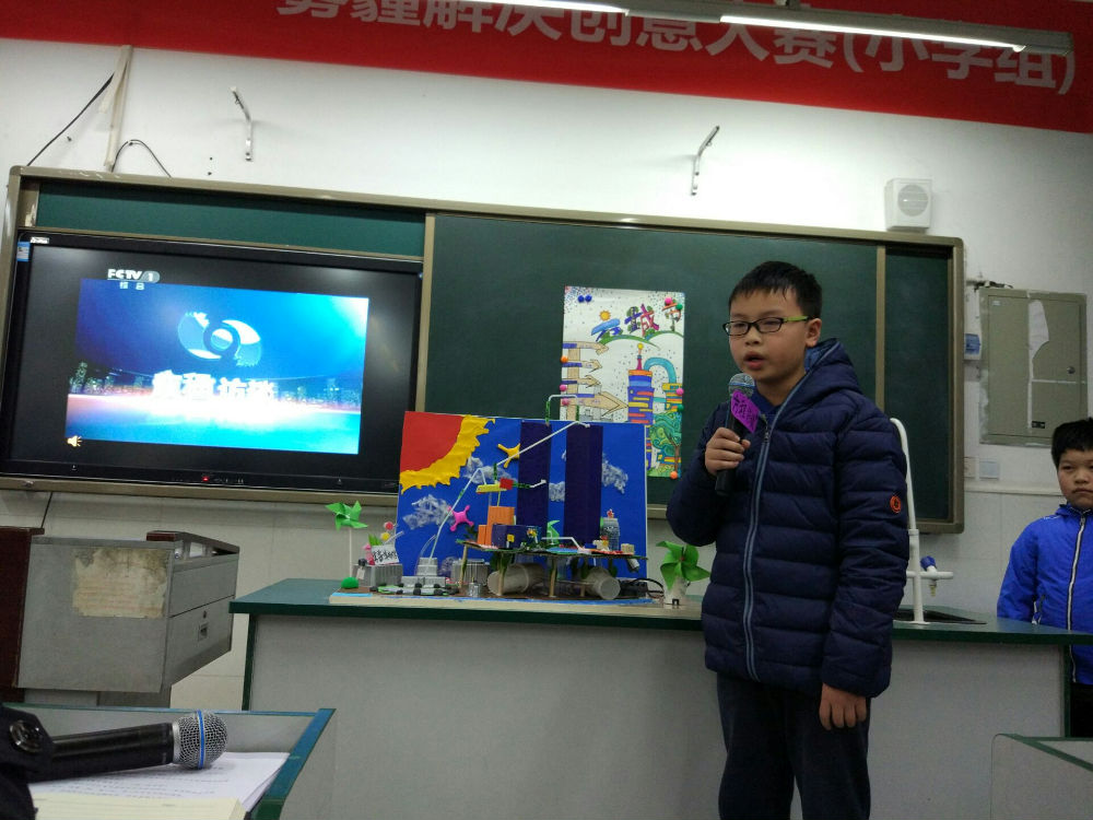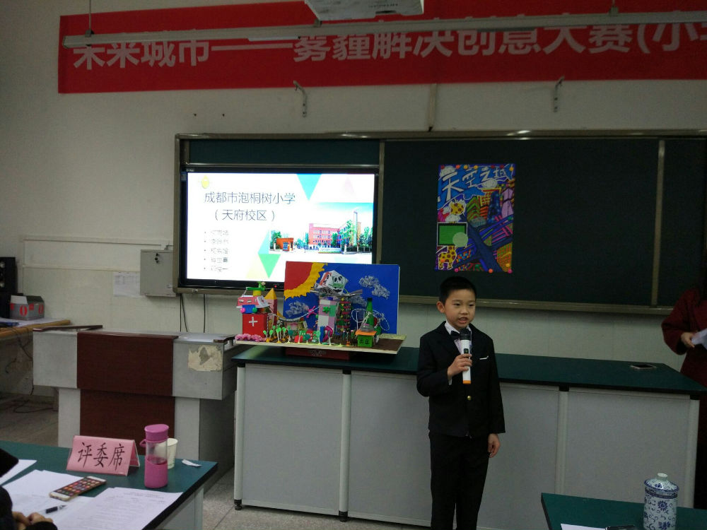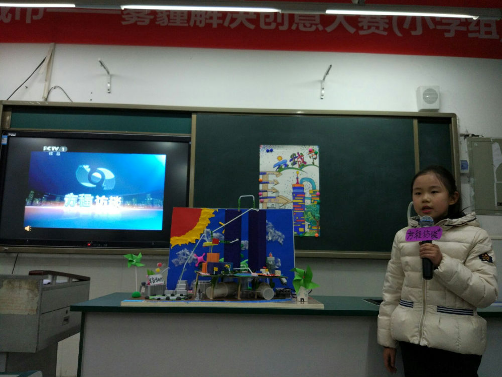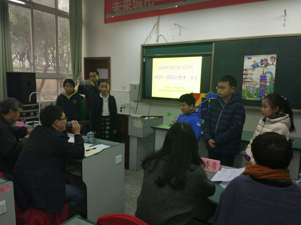 聆听了全国发明专利专家卢老师以及国家千人计划专家、哈佛大学蒲青良博士创新成长报告,老师和孩子们收益匪浅。在经过短暂的午间休息过后,就到了大家最期待的“未来城市雾霾解决创意大赛答辩”环节。答辩环节竞争激烈,全区30余所公立学校共计50余个小组参加,我校有两个小队共10名学生参赛,在经过前期认真的思考和设计后,孩子们自信、从容的向评委老师们介绍了各自未来之城的设计理念及雾霾处理办法,得到了评委老师们的高度肯定,两个小组最后分别以小组第一、小组第二的成绩获得一等奖。颁奖典礼上孩子们心情激动,双手接过奖状,放在胸前,脸上微笑洋溢。