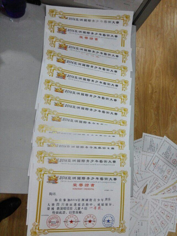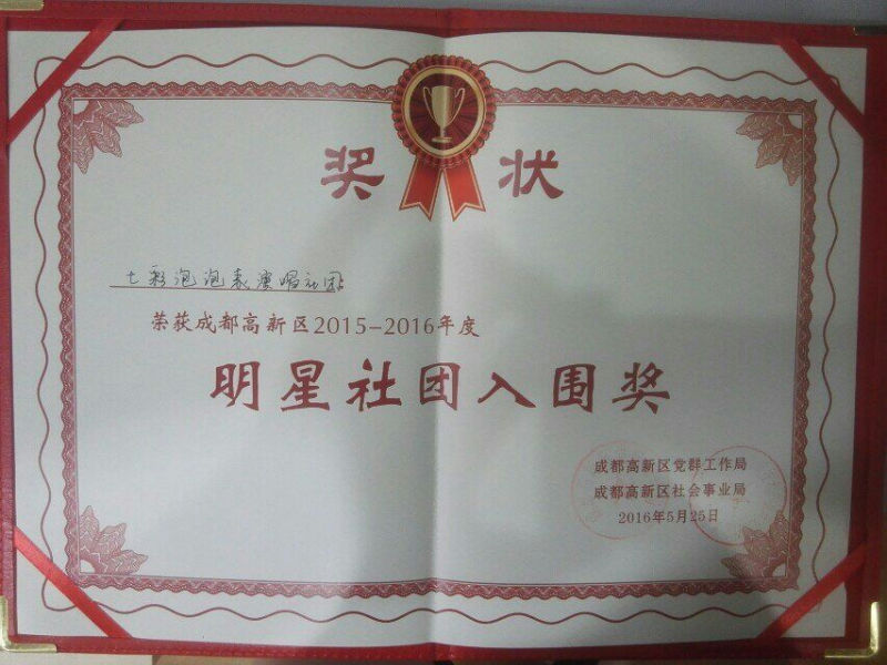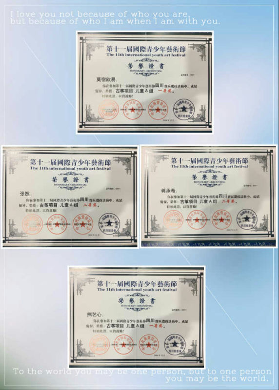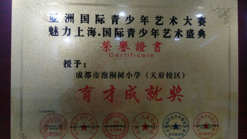 我校秉承“为每一个学生发展的最大可能性负责”的原则,在艺术工作中多次为每个孩子提供多种平台。音乐组老师在校领导的关心帮助下,在万里燕、干波、邓淑月几位老师的带领下,坚持课堂和我型我秀、特色社团三条路线走的方式,努力搭建展示平台,设计经典节目,排练指导,让优秀的孩子更优秀,让更多平凡的孩子更自信,喜爱音乐,投入到音乐的实践中来。几年来,我们先后为亚洲青少年艺术大赛盛典推荐优秀的艺术苗子,为成都市艺术人才大赛输送人才,硕果累累!今天,我校获得了亚洲国际青少年艺术大赛魅力上海.国际青少年艺术盛典颁发的“育才成就奖”。谢谢学校的支持和理解,我们默默地工作得到了家长和孩子的认可!未来。我们将坚持不懈,继续努力!
