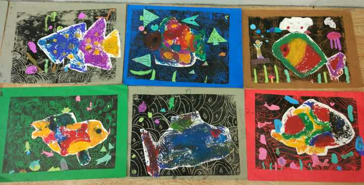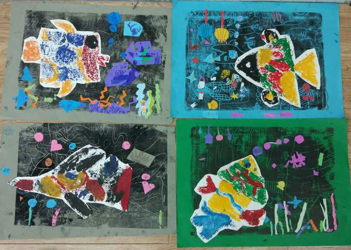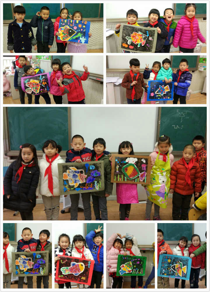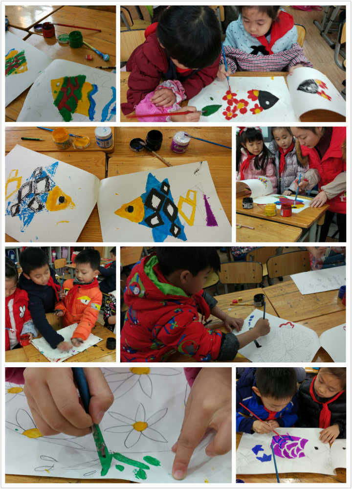 一年级胡冰清老师结合美术教材《谁画的鱼最大》一课进行了前期的综合粉印版画探索:通过网络图片收集、了解粉印版画的创作过程,小泡泡们创作了一条条又大又美丽的鱼儿。看,孩子们拿着手中的颜料正兴致勃勃地创作着!