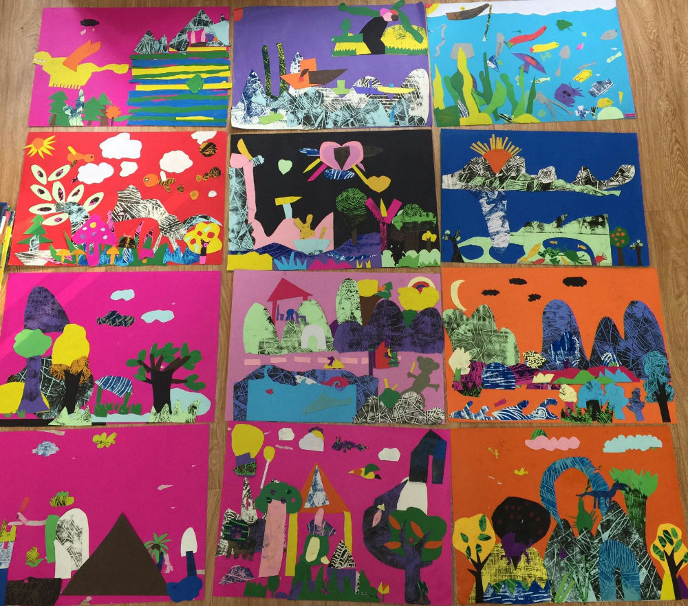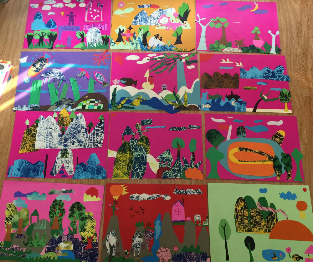 二年级卿敏老师以风景山水为主题,创作了一幅幅生动的创意综合纸版画。在创作过程中,卿敏老师结合插画的元素,使综合纸版画更加具有时代性、创意性。