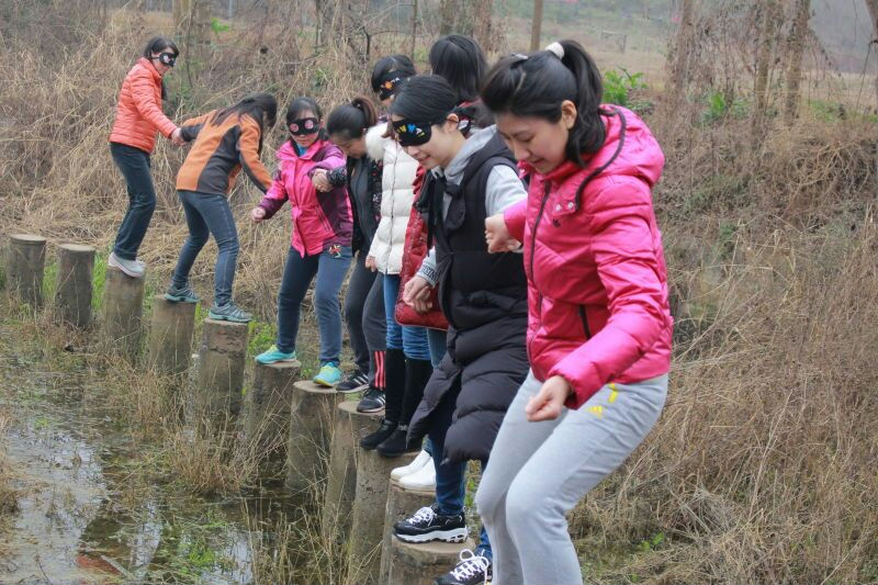 “盲人过梅花桩”是此次素质拓展的第二个项目。在活动中,队员两人一组,一位队员要帮助“盲人”解决种种困难踩过梅花桩到达目的地。在这段特殊组合的旅途中, 前面一位队员虽然能用言语告知“盲人”该如何前进,可是对于戴着眼罩的“盲人”来说,要在漆黑一片之下安全地踩到梅花桩上也是非常难的一件事,因为稍有个不小心,就会两人一起掉进水里。摘下眼罩的那一刻,很多搭档都激动地拥抱在了一起,是对彼此的鼓励和信任让大家攻克了这一难过。