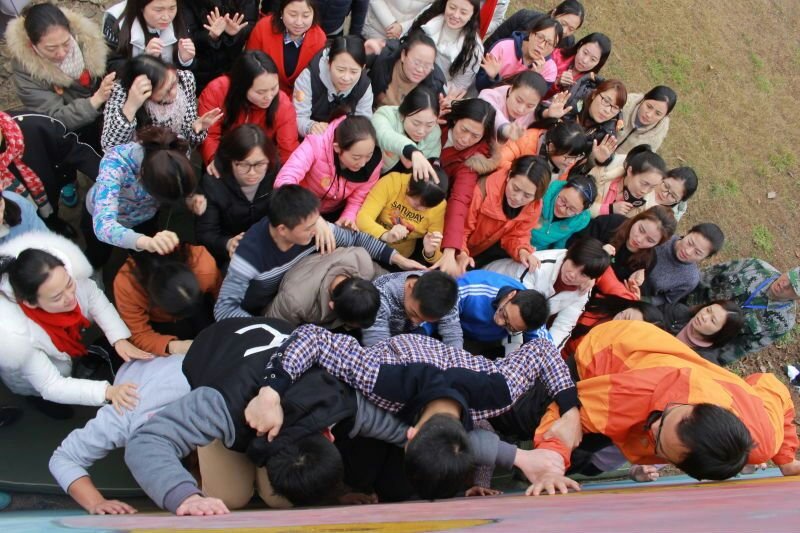 而让大家感触最深的还是“毕业墙”救援项目,此项目中每个人都要翻越一堵大约4米且垂直的围墙,这是一个必须依靠集体的力量才能完成的项目。刚开始,大家都望而却步,认为根本是一个没法完成的任务。 通过集思广益,我们拟定了计划,采用“叠人墙”的方法,让身强力壮的六位男教师为底座,再由两位男教师踩在他们的肩膀先上围墙,然后他们在上面接应,其他同伴踩着底座同伴的肩膀,一个一个成功地翻越了高墙。整个过程历时不过15分钟,活动结束后,所有队员都为自己和团队的精彩表现鼓掌、欢呼。那一刻的场面激动人心,回头再看看底座老师们满身的泥沙,红红的肩膀,许多老师都默默地留下了眼泪。这让我们懂得在协作中完成“不可能”的任务;成功的团队没有弱者,失败的团队没有强者,作为团队的一员,每一个人都有责任和义务尽自己最大的努力,因为团队的成功就是个人的成功。