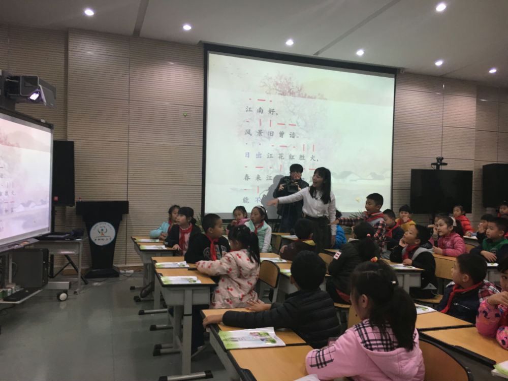 首先,我校的何红雨老师带来了一堂《江南》为主题的古诗词教学,江南在所有时代的卷轴里都是那么诗情画意,那么丰饶美丽。何老师首先从朗读的平仄、歌诀入手指导朗读,让孩子们用自己喜欢的方式读,那字字句句已浸润到孩子的心田。让学生于低吟高诵之间初识江南厚重的文化,感知江南独特的风韵,赞美江南醉人的美景,有的小组击掌打节奏、有的拍着书桌。正当孩子们在江南的如画风景中流连往返之时,何老师又带着孩子们走进了宋代、元代、清代、现代的《江南》诗词。听者亦沉醉其中!