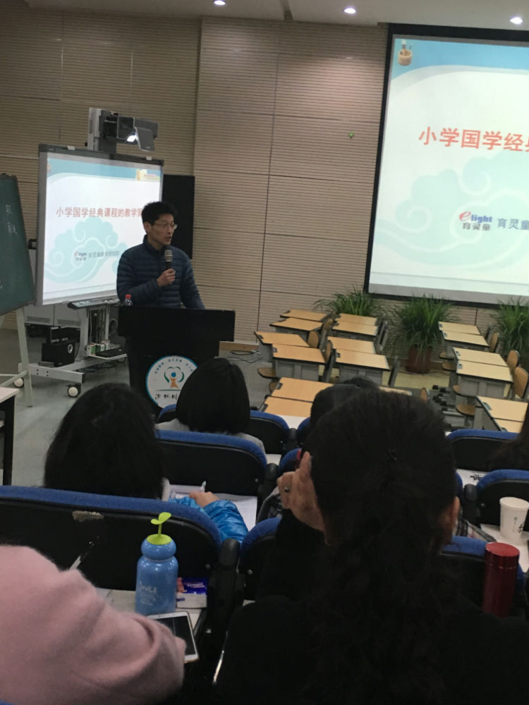 接着育灵童教育研究院王东亮老师为老师们带来“小学国学经典课程的教学策略”,王老师清晰而使用的指导,让在座老师对国学研究又了更浓厚的兴趣和热情。让国学经典“诵读化”“情景化”“故事化”“生活化”,国学就在咱们身边。