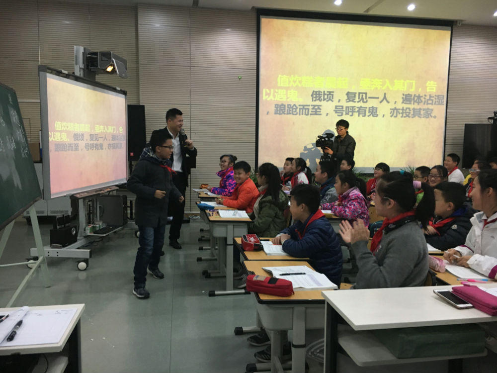 紧随王老师的讲座,我校的周强老师带来了第二堂《活见鬼》,周老师重在激发学生对文言文的兴趣,让学生喜爱文言文。开课伊始就带孩子们猜猜“鬼”字。从朗读入手,由浅入深,孩子们学得兴趣盎然,不但学会了据义断句,而且品读背诵,积累了语言文字,给我们执教文言文做了一个很好地示范,通过读的引领,水到渠成,为学生们顺势呈现出了文言文学习的方法:读准字音、读通句子、读懂文意。
