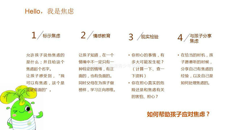如何应对孩子的“焦虑”?这是一个循序渐进的过程,也是一个能和孩子交流沟通的机会。当孩子的语言发展不完善时,需要给他害怕和焦虑的东西命名;倾听他们的感情时,我们让孩子总结,整合左右脑。