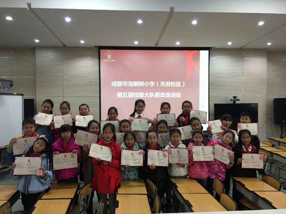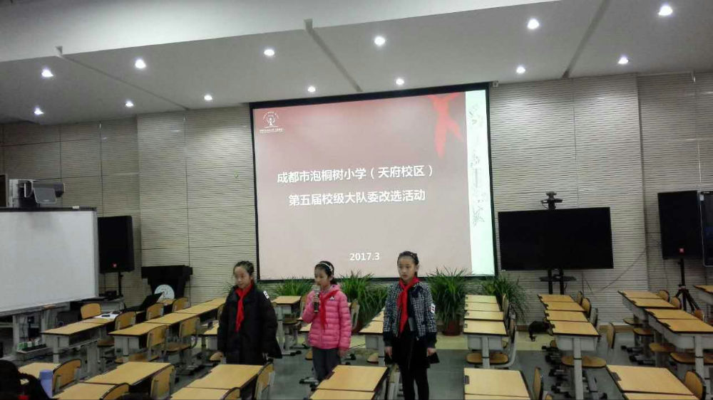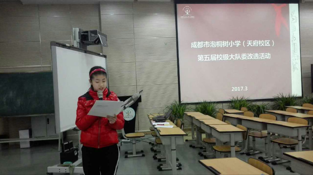 成都市泡桐树小学(天府校区)2017—2018学年度大队委选拔于2017年3月17日中午1点在学校多功能厅隆重举行,本次参与大队为竞选的共有候选人27名,评委44名,分别由三至五年级各班1名学生代表组成的学生评委22名、六年级大队委代表9名、家委会代表6名、教师代表7名构成。通过演讲竞选、评委投票的方式最终产生本届校级大队委(共计23名)。