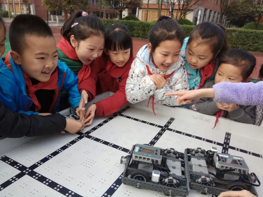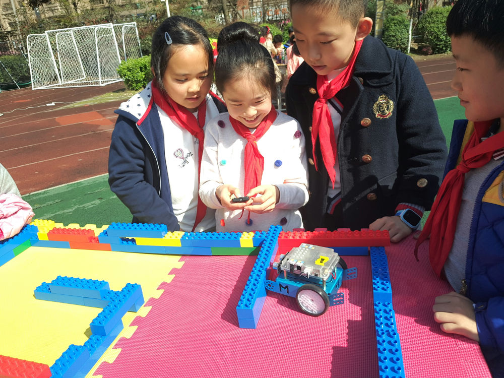 mBot齿轮抢夺赛中配备了两台mBot机器人,孩子们分为两队,通过操控遥控手柄,控制机器人撞击对方的机器人,哪队的机器人尾部的感应装置先被撞击到,哪队就输了,而另一方则获得胜利。为了保护己方机器人的尾部,孩子们拼尽全力。有的孩子对手柄操作不熟悉,一上来就让己方的机器人直直的后退,结果尾部的感应器撞到了围栏,“自动认了输”,令人大为叹惋;有的孩子机器人倒是操控对了,双方的机器人进行了一场力量上的角逐,最终有一方还是被推到了围栏上,功亏一篑。此起彼伏的赛况引得围观的孩子惊呼连连,场面一时热闹非凡。