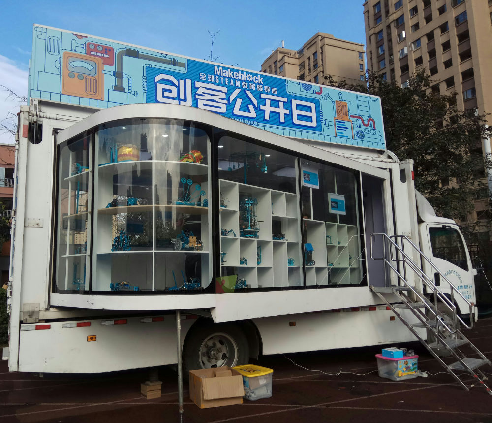 本次创客大篷车展示分为五个区域,分别为mBot齿轮抢夺赛、mBot足球赛、mBot迷宫竞赛、3D打印笔体验区以及创客大篷车内部展览。