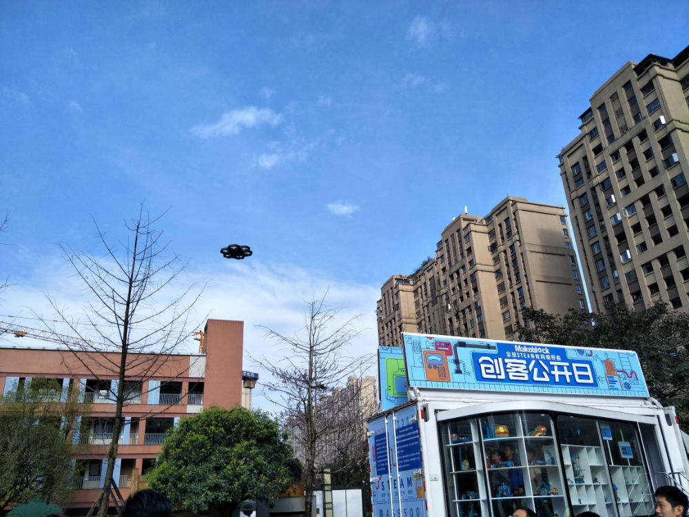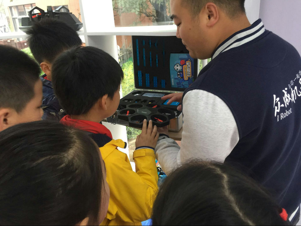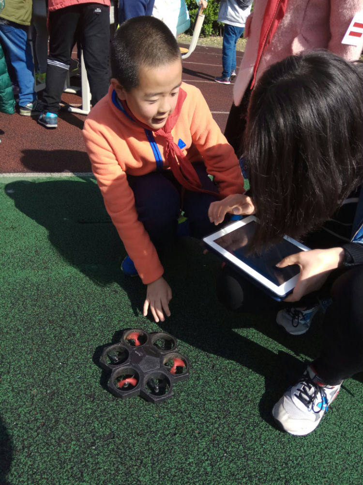 有孩子还在车里发现了一个非常特别的机器人,那就是飞行机器人。老师带着他们到车外,让他们亲自体会了一下如何操作飞行机器人。在蓝天白云的衬托下,孩子们天真无邪的笑颜深深地吸引了在场的每一个人。