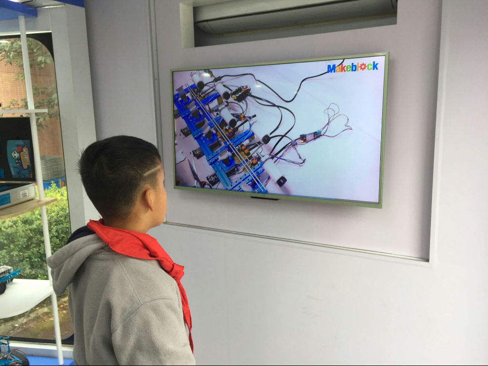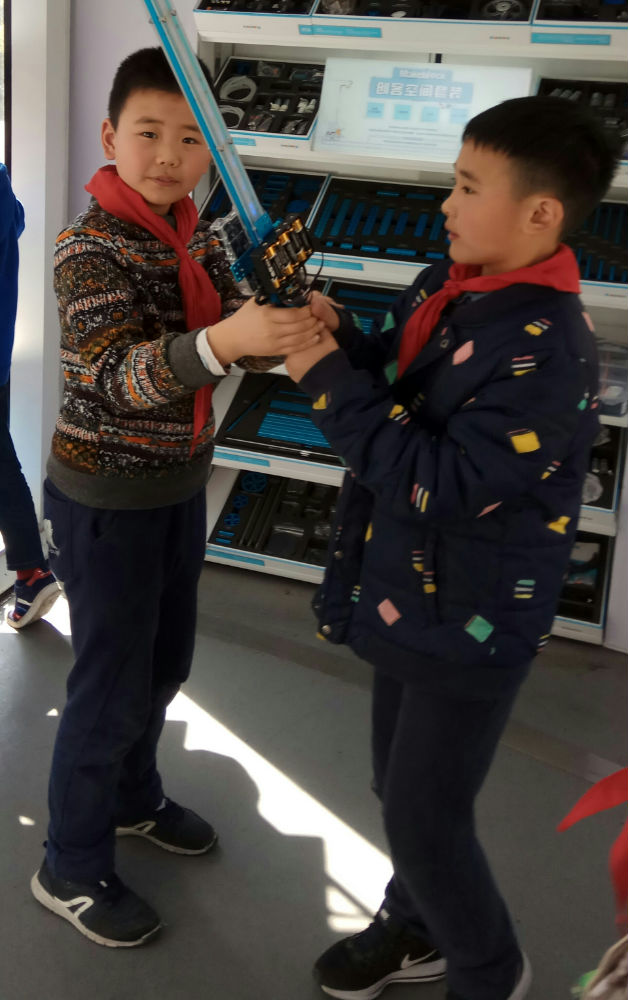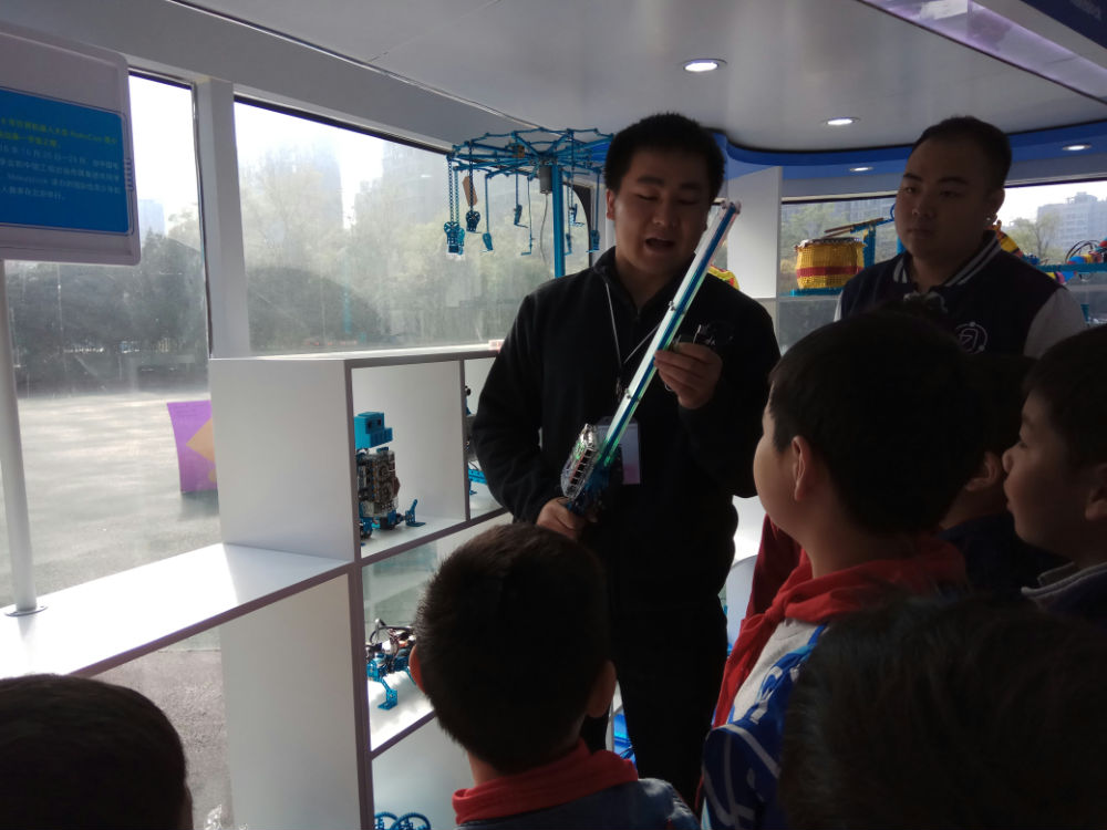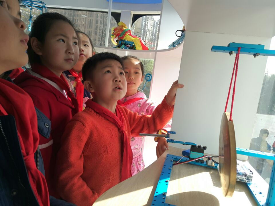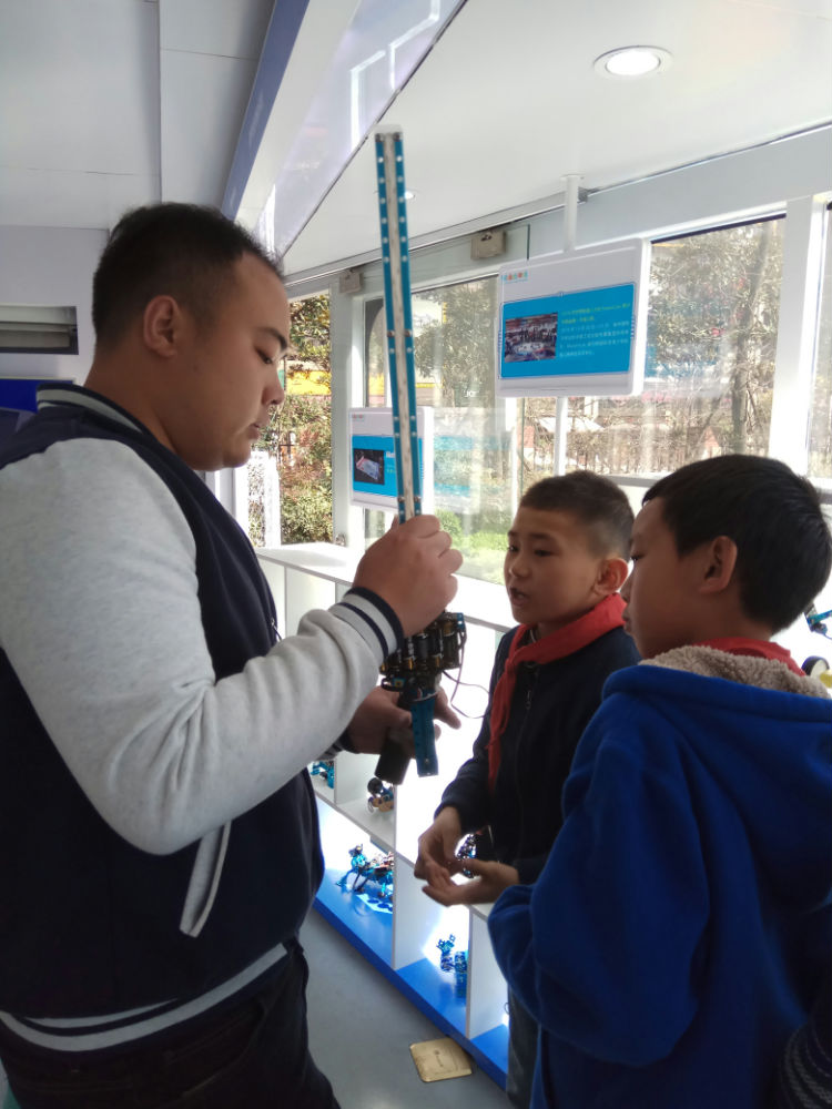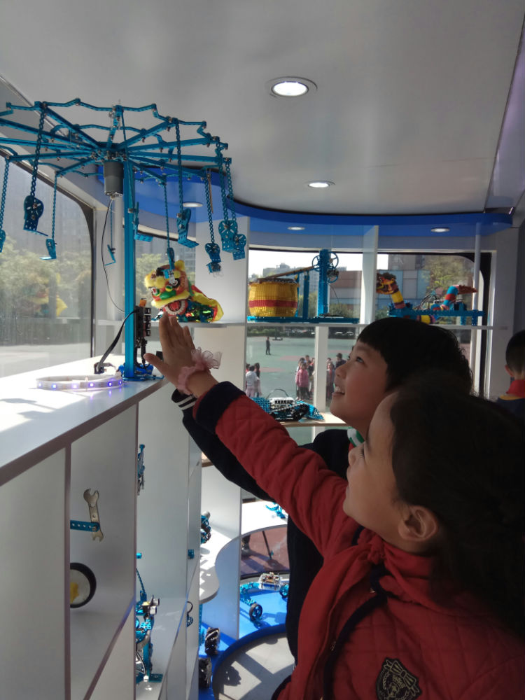 最后就是这次活动最重要也是最核心的部分了,那就是创客大篷车内部的展览。孩子们在车门口排起了长龙,恨不得飞进车里去参观。进到车里的同学们,更是这里看看,那里摸摸,好奇的不行。在车里负责带领孩子们参观的解说老师立刻组织好他们,向他们介绍车里的每个部分。这里有打开开关回自己敲鼓的机器人,有舞龙舞狮的机器人,还有感应到人走近了就开屏的“孔雀机器人”!孩子们都惊讶坏了。解说老师告诉他们,这个机器人安装了一个超声波感应器,能自动探测到物体的远近,物体靠近了,就给机器人上安装的电路一个讯息,电路带动机器人上安装的“尾巴”,“孔雀”自然就开屏啦!在这里,孩子们还看到了刚才操作过的用来踢球、走迷宫的机器人,它们静静地待在展览格里,看起来普普通通的,完全想不到可以用来“踢球格斗”!