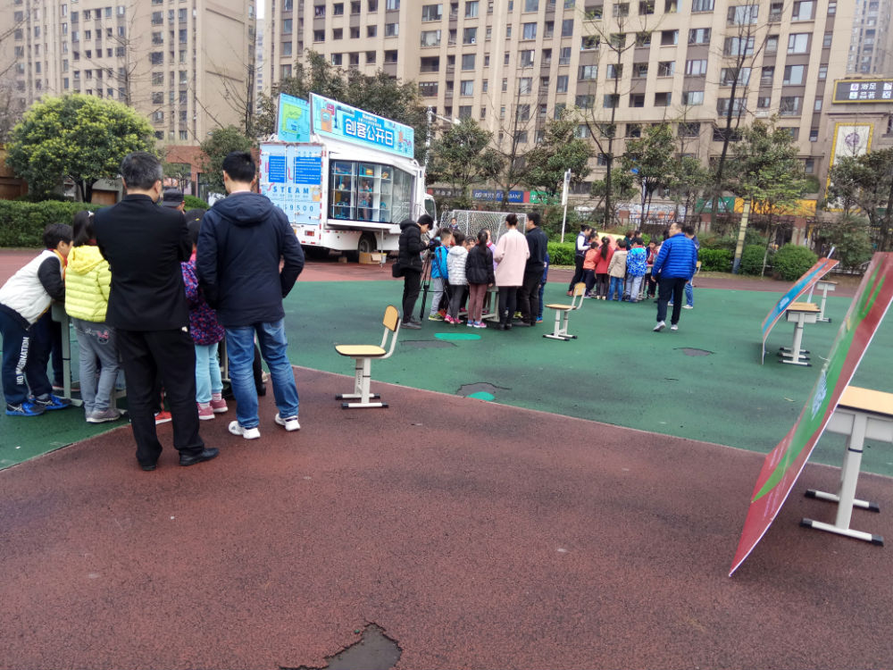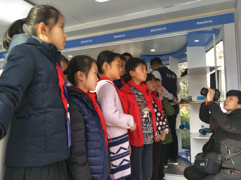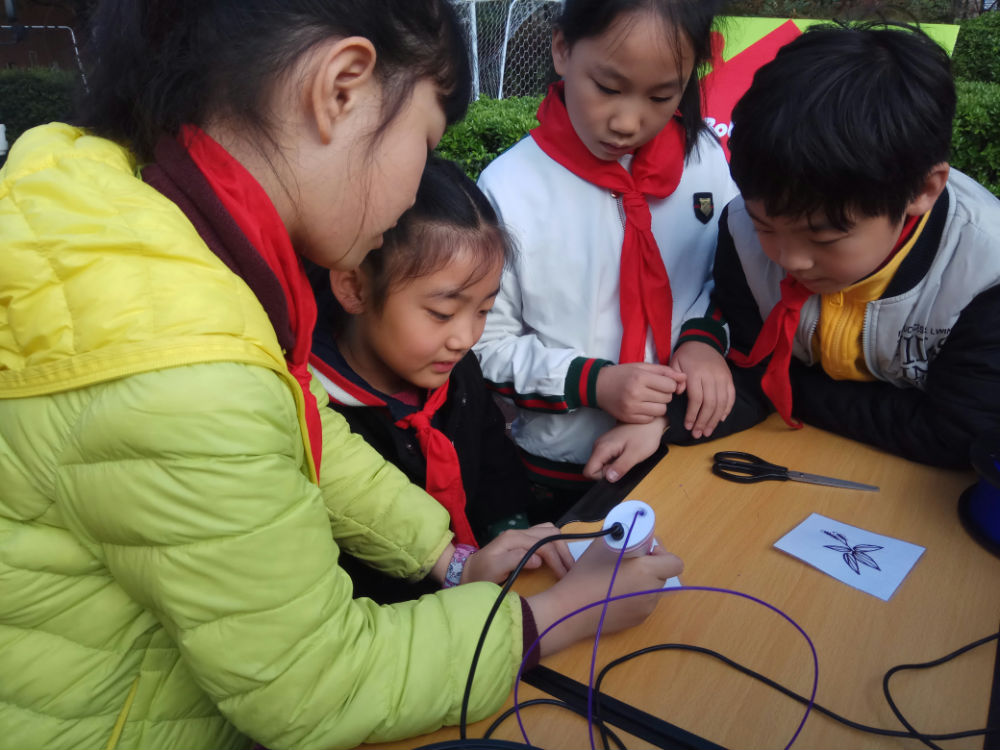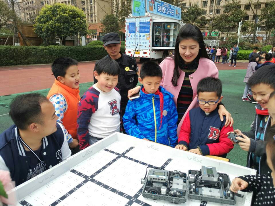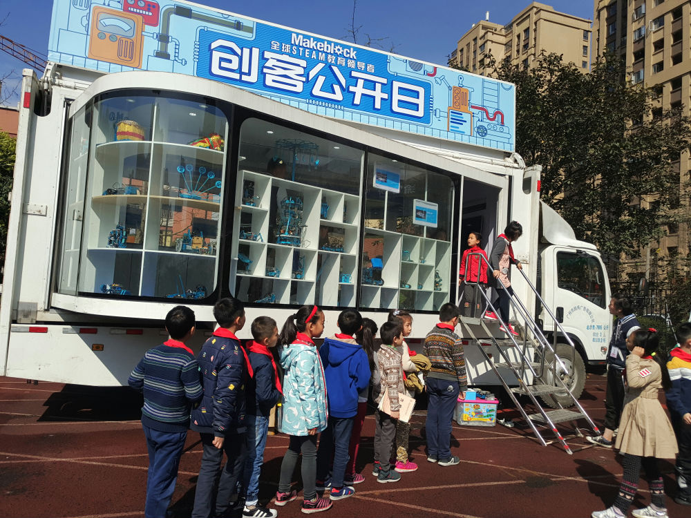 2017年3月30日,星期四,成都市泡桐树小学(天府校区)的校园里迎来了久违的阳光,三年级的孩子们也迎来了等待已久的创客大篷车走进校园的活动。