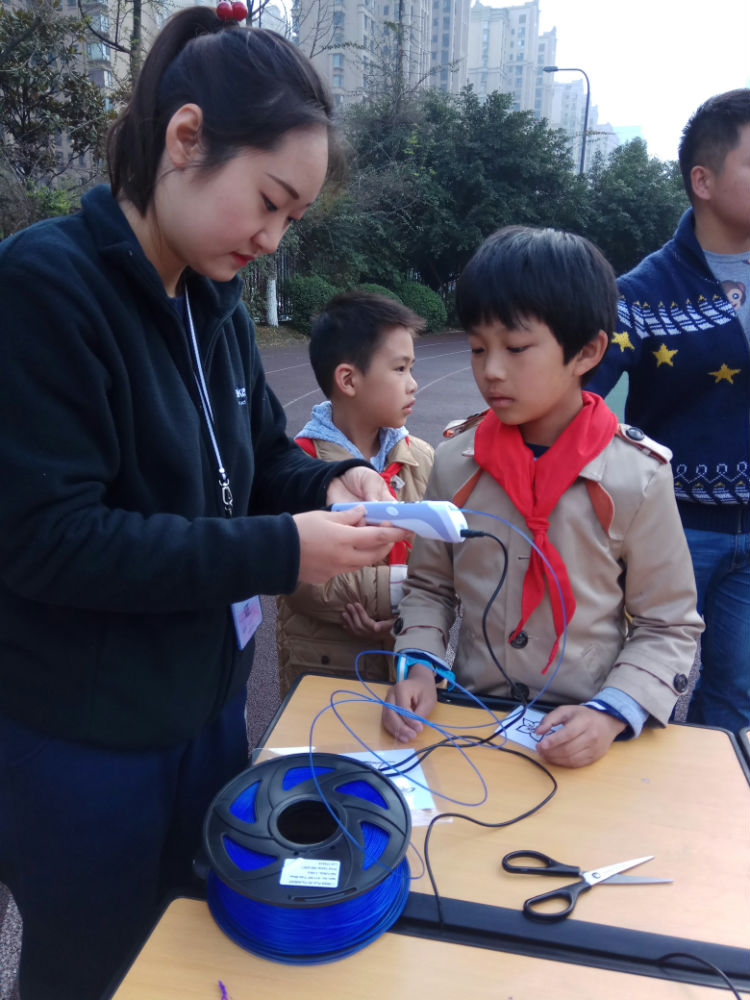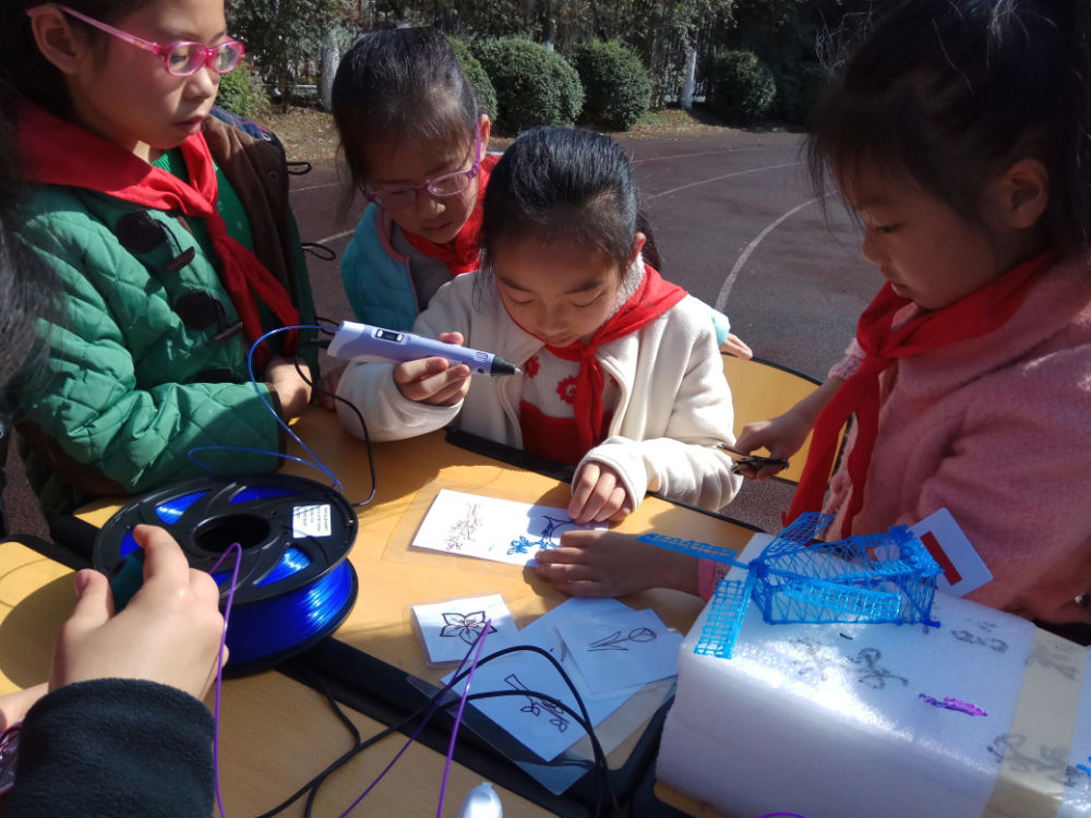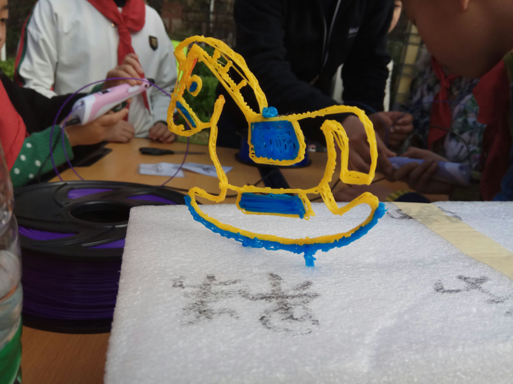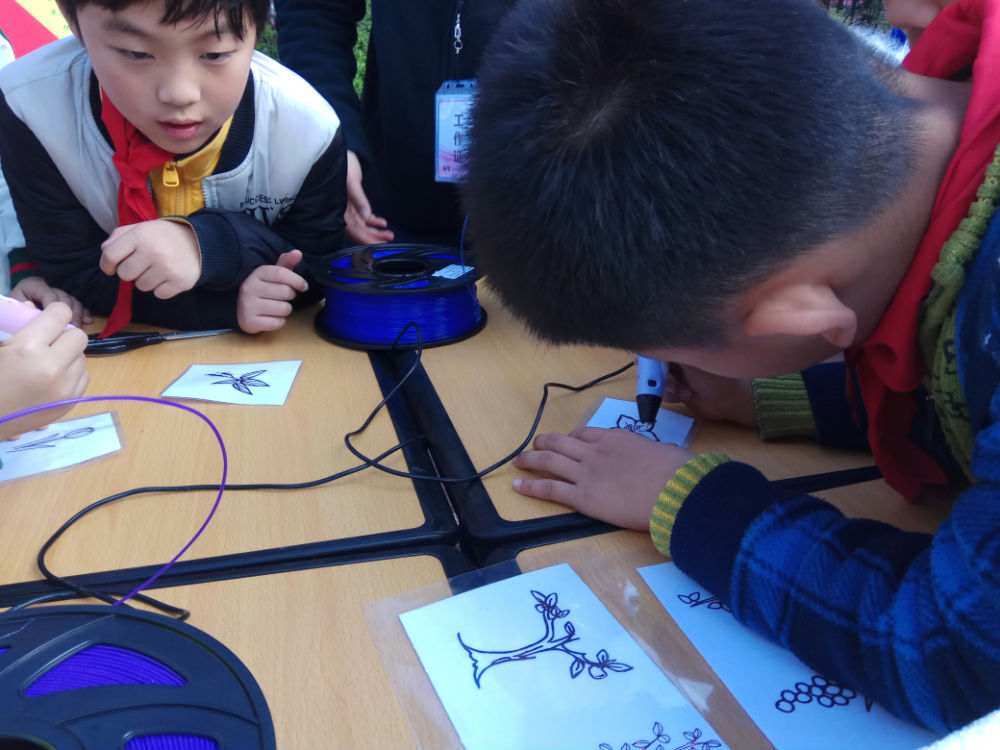 接着是3D打印笔的体验区,这可是女孩子们的兴趣乐园了,用一只看起来简简单单普普通通的笔,竟然能画出自己喜欢的图案,孩子们高兴坏了。一个个拿起笔,趴到桌子上专注地画着自己的作品。完成后,更是喜滋滋地拿着自己的作品给同学和老师展示,一个个都成了“妙笔生花的神笔马良”。