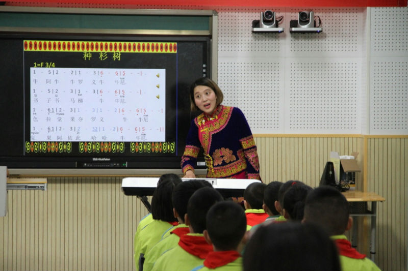 2017年3月29日,一个阳光灿烂的日子,我们来到了美丽的电子科大实验中学附属实验小学,我校音乐教师何国英参加了” 凉山自治州中小学音乐课程资源开发与应用”研究课例展示.何国英老师执教的课例为《种杉树》,何老师通过用彝语单词卡片,放入音乐情景中进行角色扮演,与音乐相结合进行有节奏地读歌词,降低了彝语学习的难度,让孩子在劳动情景的创设中学会了这首彝族歌曲,并且用彝语完整地演绎歌曲,用语言、舞蹈、戏剧等多种形式来完整地表现的阿公和妞妞在歌声中劳动、打趣的情景。从孩子的期待的眼神里看到了对何老师这堂课喜欢,从老师的掌声里听出了大家对何老师攻破彝语发音和演唱难点的折服,无疑,何老师这堂课是非常精彩的!回顾这一年,音乐组老师在领导的关心下,在万里燕、邓淑月老师的带领下做了“基于奥尔夫教学理念下的小学音乐教材歌曲唱歌教学策略的研究”的课题,全组老师学习奥尔夫教学理念,研究教材,进行奥尔夫本土化的教材研究,其中,以研究母语化的具有中国特色文化的教材为研究的对象,地方性语言歌曲和少数民族歌曲成典型代表。在何国英老师的这节《种杉树》的课堂上,音乐组的每一位老师都献计献策,找聚焦点,找难点的突破口,进行以彝族语言为特色的歌唱教学研究策略的大胆探索,,用奥尔夫的国际视野把教材研究与传承中国民族文化进行了整合,是一次大胆地尝试,也是目前课题的阶段汇报成果课例之一!期待,我们的课题阶段性成果能够得到大家的亲睐!