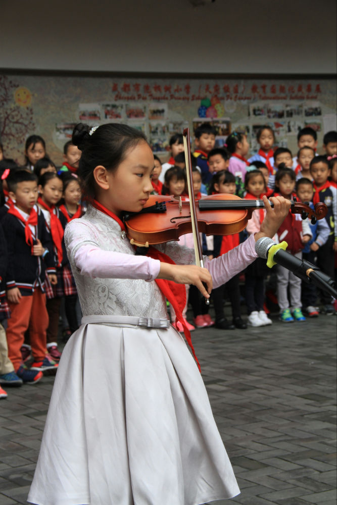 看!一串串金色的音符跳动起来啦!优雅的礼服,娴熟的姿势,你能猜得出这是二年级的小朋友演奏出来的吗?