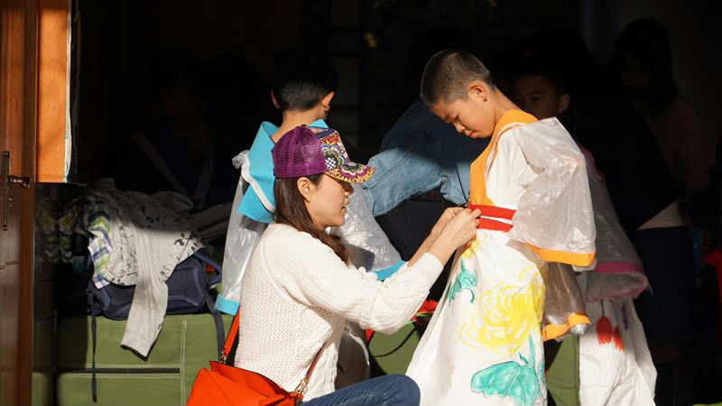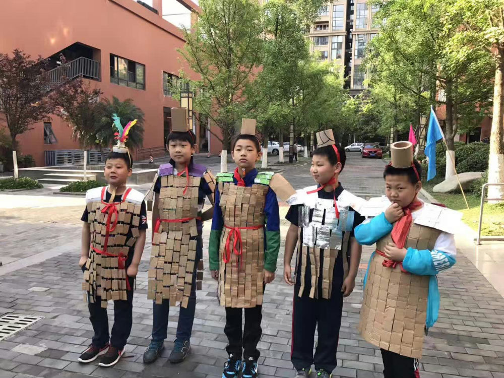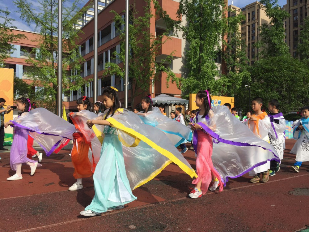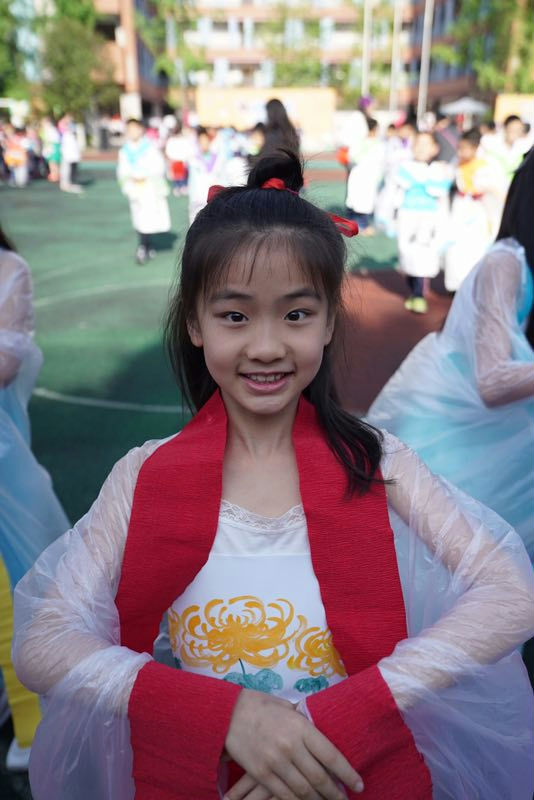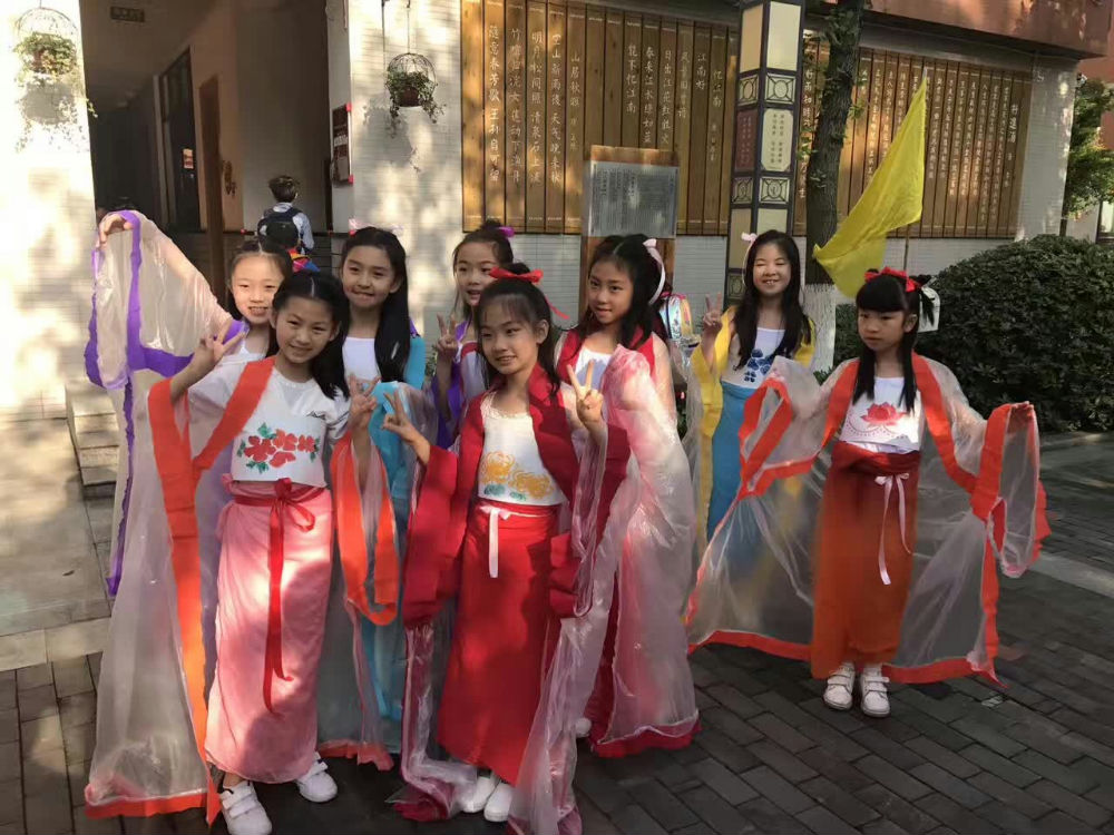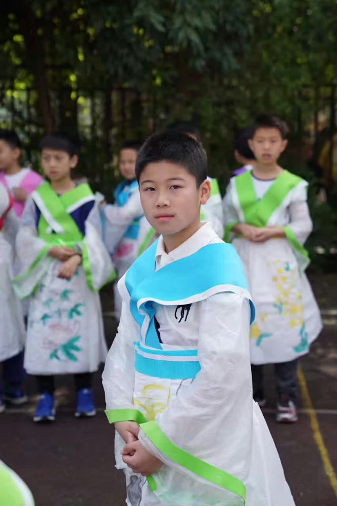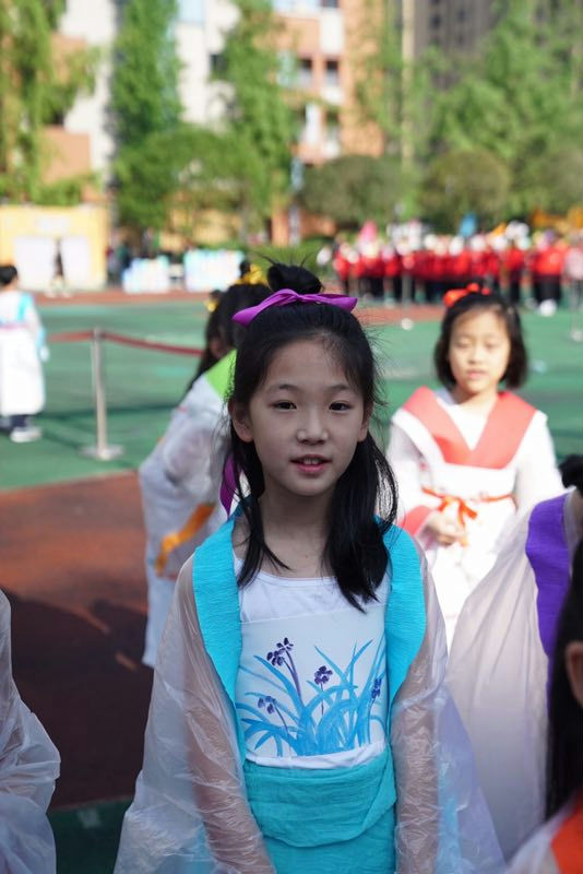 在一番紧张的准备之后,这里走出了7个身披“铠甲”的武士,他们身材高大,很有气势。紧接着,又从教室里,飘出了10几个小“仙女”,头挽彩带,身披与彩带同色镶边的长披风,走起路来,摇曳生姿;最后涌出的是20,30个身着汉服的小童子,身上梅、兰、竹、菊的手绘配上汉服宽大的袖子,温文尔雅。