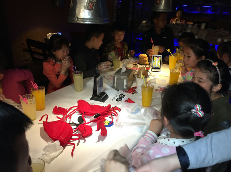 主题餐厅的成功不仅仅是它的名字和创意,更可贵的是它一丝不苟的经营流程,提供给客人完美的食物和用餐服务,以及心理体验。孩子们参观了前台、餐厅、厨房、储藏等等环节,了解各个环节的配合,还向餐厅工作的叔叔阿姨们提问,这才知道, “水货”餐厅是一家将“吃”升华到集美味和娱乐一体的全国首家无餐具餐厅,一整桶的海鲜用手开剥,想想就是原生态又自在!厨师帽不能随便戴,小泡泡们戴上别具一格的螃蟹帽子,进入到餐厅后厨参观。