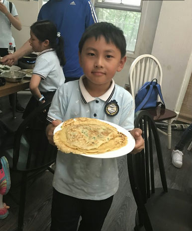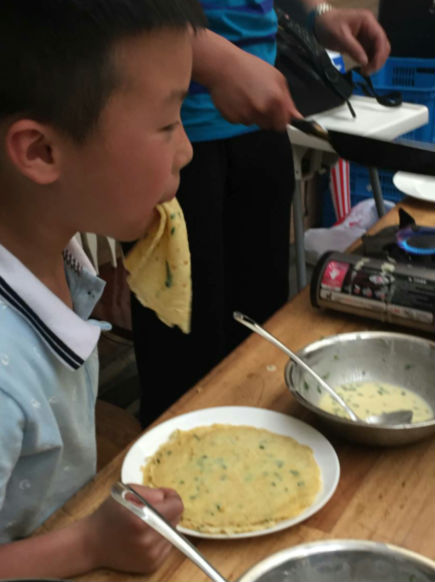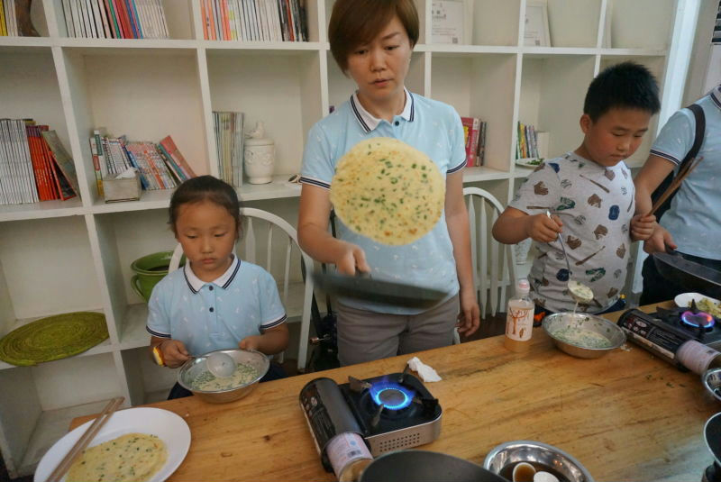 刚刚制作完盆栽,农场哥哥就来招呼大家去做野菜饼饼啦!在工作人员的示范下,小泡泡们有模有样的开始学习烙饼:浇油、放一大勺面饼糊、均匀平铺、翻转,哈哈!我的饼饼烙好了!不一会,饼香就弥漫着整个活动大厅,而每个小泡泡面前的盘子里也摆起了一张张的薄饼……